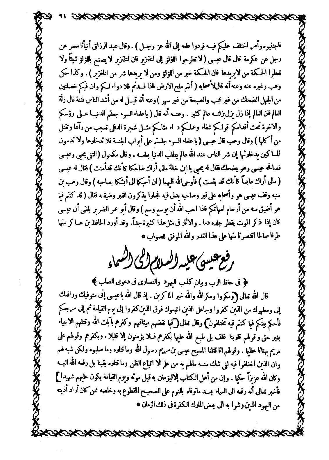 فِي حِفْظِ الرَّبِّ وَبَيَانُ كَذِبِ اليهود والنصارى فِي دَعْوَى الصَّلْبِ قَالَ اللَّهُ تَعَالَى وَمَكَرُوا وَمَكَرَ اللَّهُ وَالله خَيْرُ الْماكِرِينَ. إِذْ قَالَ اللَّهُ يَا عِيسى إِنِّي مُتَوَفِّيكَ وَرافِعُكَ إِلَيَّ وَمُطَهِّرُكَ مِنَ الَّذِينَ كَفَرُوا وَجاعِلُ الَّذِينَ اتَّبَعُوكَ فَوْقَ الَّذِينَ كَفَرُوا إِلى يَوْمِ الْقِيامَةِ ثُمَّ إِلَيَّ مَرْجِعُكُمْ فَأَحْكُمُ بَيْنَكُمْ فِيما كُنْتُمْ فِيهِ تَخْتَلِفُونَ 3: 54- 55 وقال تعالى فَبِما نَقْضِهِمْ مِيثاقَهُمْ وَكُفْرِهِمْ بِآياتِ الله وَقَتْلِهِمُ الْأَنْبِياءَ بِغَيْرِ حَقٍّ وَقَوْلِهِمْ قُلُوبُنا غُلْفٌ بَلْ طَبَعَ الله عَلَيْها بِكُفْرِهِمْ فَلا يُؤْمِنُونَ إِلَّا قَلِيلًا. وَبِكُفْرِهِمْ وَقَوْلِهِمْ عَلى مَرْيَمَ بُهْتاناً عَظِيماً. وَقَوْلِهِمْ إِنَّا قَتَلْنَا الْمَسِيحَ عِيسَى ابْنَ مَرْيَمَ رَسُولَ اللَّهِ وَما قَتَلُوهُ وَما صَلَبُوهُ وَلكِنْ شُبِّهَ لَهُمْ وَإِنَّ الَّذِينَ اخْتَلَفُوا فِيهِ لَفِي شَكٍّ مِنْهُ مَا لَهُمْ بِهِ مِنْ عِلْمٍ إِلَّا اتِّباعَ الظَّنِّ وَما قَتَلُوهُ يَقِيناً بَلْ رَفَعَهُ اللَّهُ إِلَيْهِ وَكانَ اللَّهُ عَزِيزاً حَكِيماً. وَإِنْ مِنْ أَهْلِ الْكِتابِ إِلَّا لَيُؤْمِنَنَّ بِهِ قَبْلَ مَوْتِهِ وَيَوْمَ الْقِيامَةِ يَكُونُ عَلَيْهِمْ شَهِيداً 4: 155- 159 فَأَخْبَرَ تَعَالَى أَنَّهُ رَفَعَهُ إِلَى السَّمَاءِ بَعْدَ مَا تَوَفَّاهُ بِالنَّوْمِ عَلَى الصَّحِيحِ الْمَقْطُوعِ بِهِ وَخَلَّصَهُ مِمَّنْ كَانَ أَرَادَ أَذِيَّتَهُ مِنَ الْيَهُودِ الَّذِينَ وَشَوْا بِهِ إِلَى بَعْضِ الْمُلُوكِ الْكَفَرَةِ في ذلك الزمان