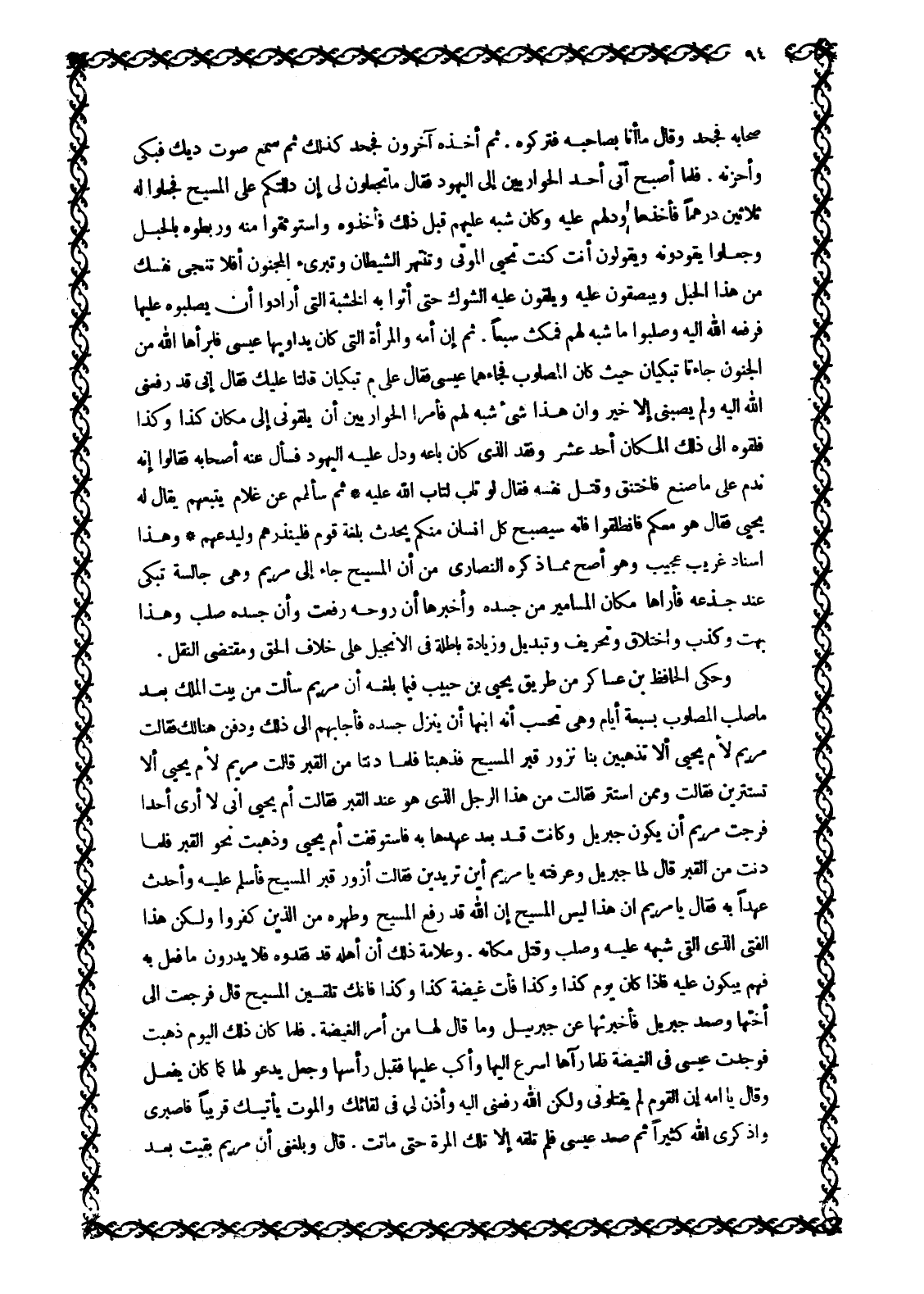 أَصْحَابِهِ فَجَحَدَ وَقَالَ مَا أَنَا بِصَاحِبِهِ فَتَرَكُوهُ. ثُمَّ أَخَذَهُ آخَرُونَ فَجَحَدَ كَذَلِكَ ثُمَّ سَمِعَ صَوْتَ دِيكٍ فَبَكَى وَأَحْزَنَهُ. فَلَمَّا أَصْبَحَ أَتَى أَحَدُ الْحَوَارِيِّينَ إِلَى الْيَهُودِ فَقَالَ مَا تَجْعَلُونَ لِي إِنْ دَلَلْتُكُمْ عَلَى الْمَسِيحِ فَجَعَلُوا لَهُ ثَلَاثِينَ دِرْهَمًا فَأَخَذَهَا وَدَلَّهُمْ عَلَيْهِ وَكَانَ شُبِّهَ عَلَيْهِمْ قَبْلَ ذَلِكَ فَأَخَذُوهُ وَاسْتَوْثَقُوا مِنْهُ وَرَبَطُوهُ بِالْحَبْلِ وَجَعَلُوا يَقُودُونَهُ وَيَقُولُونَ أَنْتَ كُنْتَ تُحْيِي الْمَوْتَى وَتَنْتَهِرُ الشَّيْطَانَ وَتُبْرِئُ الْمَجْنُونَ أَفَلَا تُنَجِّي نَفْسَكَ مِنْ هَذَا الْحَبْلِ وَيَبْصُقُونَ عَلَيْهِ وَيُلْقُونَ عَلَيْهِ الشَّوْكَ حَتَّى أَتَوْا بِهِ الْخَشَبَةَ الَّتِي أَرَادُوا أَنْ يَصْلُبُوهُ عَلَيْهَا فَرَفَعَهُ اللَّهُ إِلَيْهِ وَصَلَبُوا مَا شُبِّهَ لَهُمْ فَمَكَثَ سَبْعًا. ثُمَّ إِنْ أُمَّهُ وَالْمَرْأَةَ الَّتِي كَانَ يُدَاوِيهَا عِيسَى فَأَبْرَأَهَا اللَّهُ مِنَ الْجُنُونِ جَاءَتَا تَبْكِيَانِ حَيْثُ كان المصلوب فجاءهما عيسى فقال على م تَبْكِيَانِ قَالَتَا عَلَيْكَ فَقَالَ إِنِّي قَدْ رَفَعَنِي اللَّهُ إِلَيْهِ وَلَمْ يُصِبْنِي إِلَّا خَيْرٌ وَإِنَّ هَذَا شَيْءٌ شُبِّهَ لَهُمْ فَأْمُرَا الْحَوَارِيِّينَ أَنْ يَلْقَوْنِي إِلَى مَكَانِ كَذَا وَكَذَا فَلَقَوْهُ إِلَى ذَلِكَ الْمَكَانِ أَحَدَ عَشَرَ وَفَقَدَ الَّذِي كَانَ بَاعَهُ وَدَلَّ عَلَيْهِ الْيَهُودَ فَسَأَلَ عَنْهُ أَصْحَابَهُ فَقَالُوا إِنَّهُ نَدِمَ عَلَى مَا صَنَعَ فَاخْتَنَقَ وَقَتَلَ نَفْسَهُ فَقَالَ لَوْ تَابَ لَتَابَ اللَّهُ عَلَيْهِ ثُمَّ سَأَلَهُمْ عَنْ غُلَامٍ يَتْبَعُهُمْ يُقَالُ له يحيى فَقَالَ هُوَ مَعَكُمْ فَانْطَلِقُوا فَإِنَّهُ سَيُصْبِحُ كُلُّ إِنْسَانٍ مِنْكُمْ يُحَدِّثُ بِلُغَةِ قَوْمٍ فَلْيُنْذِرْهُمْ وَلْيَدْعُهُمْ وَهَذَا إِسْنَادٌ غَرِيبٌ عَجِيبٌ وَهُوَ أَصَحُّ مِمَّا ذكره النصارى مِنْ أَنَّ الْمَسِيحَ جَاءَ إِلَى مَرْيَمَ وَهِيَ جَالِسَةٌ تَبْكِي عِنْدَ جِذْعِهِ فَأَرَاهَا مَكَانَ الْمَسَامِيرِ مِنْ جَسَدِهِ وَأَخْبَرَهَا أَنَّ رُوحَهُ رُفِعَتْ وَأَنَّ جَسَدَهُ صُلِبَ وَهَذَا بُهْتٌ وَكَذِبٌ وَاخْتِلَاقٌ وَتَحْرِيفٌ وَتَبْدِيلٌ وَزِيَادَةٌ بَاطِلَةٌ فِي الْإِنْجِيلِ عَلَى خِلَافِ الحق ومقتضى النقل.