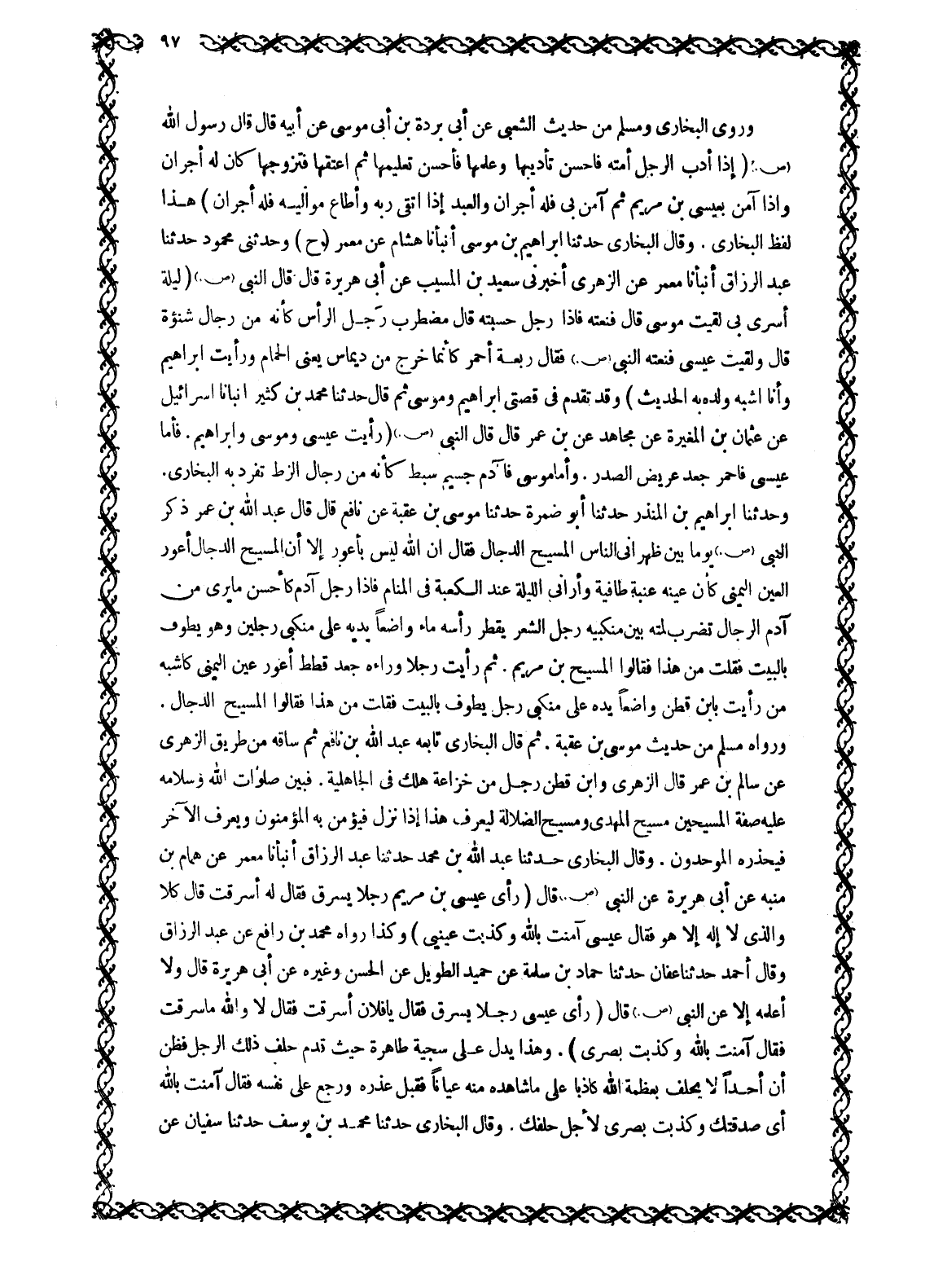 وَرَوَى الْبُخَارِيُّ وَمُسْلِمٌ مِنْ حَدِيثِ الشَّعْبِيِّ عَنْ أَبِي بُرْدَةَ بْنِ أَبِي مُوسَى عَنْ أَبِيهِ قَالَ قَالَ رَسُولُ اللَّهِ صَلَّى اللَّهُ عَلَيْهِ وَسَلَّمَ (إِذَا أَدَّبَ الرَّجُلُ أَمَتَهُ فَأَحْسَنَ تَأْدِيبَهَا وَعَلَّمَهَا فَأَحْسَنَ تَعْلِيمَهَا ثُمَّ أَعْتَقَهَا فَتَزَوَّجَهَا كَانَ له أجران وإذا آمن بعيسى بن مَرْيَمَ ثُمَّ آمَنَ بِي فَلَهُ أَجْرَانِ وَالْعَبْدُ إِذَا اتَّقَى رَبَّهُ وَأَطَاعَ مَوَالِيَهِ فَلَهُ أَجْرَانِ) هَذَا لَفْظُ الْبُخَارِيِّ. وَقَالَ الْبُخَارِيُّ حَدَّثَنَا إِبْرَاهِيمُ بْنُ مُوسَى أَنْبَأَنَا هِشَامٌ عَنْ مَعْمَرٍ (ح) وَحَدَّثَنِي مَحْمُودٌ حَدَّثَنَا عَبْدُ الرَّزَّاقِ أَنْبَأَنَا مَعْمَرٌ عَنِ الزُّهْرِيِّ أَخْبَرَنِي سَعِيدُ بْنُ الْمُسَيِّبِ عَنْ أَبِي هُرَيْرَةَ قَالَ قَالَ النَّبِيُّ صَلَّى اللَّهُ عَلَيْهِ وَسَلَّمَ (لَيْلَةَ أُسَرِيَ بِي لَقِيتُ مُوسَى قَالَ فَنَعَتَهُ فَإِذَا رَجُلٌ حِسْبْتُهُ قَالَ مُضْطَرِبٌ رَجِلُ الرَّأْسِ كَأَنَّهُ مِنْ رِجَالِ شَنُوءَةَ قَالَ وَلَقِيتُ عِيسَى فَنَعَتَهُ النَّبِيُّ صَلَّى اللَّهُ عَلَيْهِ وَسَلَّمَ فَقَالَ رَبْعَةٌ أَحْمَرُ كَأَنَّمَا خَرَجَ مِنْ دِيمَاسٍ يَعْنِي الْحَمَّامَ وَرَأَيْتُ إِبْرَاهِيمَ وأنا أشبه ولده به الحديث) وقد تقدم فِي قِصَّتَيْ إِبْرَاهِيمَ وَمُوسَى ثُمَّ قَالَ حَدَّثَنَا مُحَمَّدُ بْنُ كَثِيرٍ أَنْبَأَنَا إِسْرَائِيلُ عَنْ عُثْمَانَ بن المغيرة عن مجاهد عن بن عُمَرَ قَالَ قَالَ النَّبِيُّ صَلَّى اللَّهُ عَلَيْهِ وَسَلَّمَ (رَأَيْتُ عِيسَى وَمُوسَى وَإِبْرَاهِيمَ. فَأَمَّا عِيسَى فَأَحْمَرُ جَعْدٌ عَرِيضُ الصَّدْرِ. وَأَمَّا مُوسَى فَآدَمُ جَسِيمٌ سِبْطٌ كَأَنَّهُ مِنْ رِجَالِ الزُّطِّ تَفَرَّدَ بِهِ الْبُخَارِيُّ.
