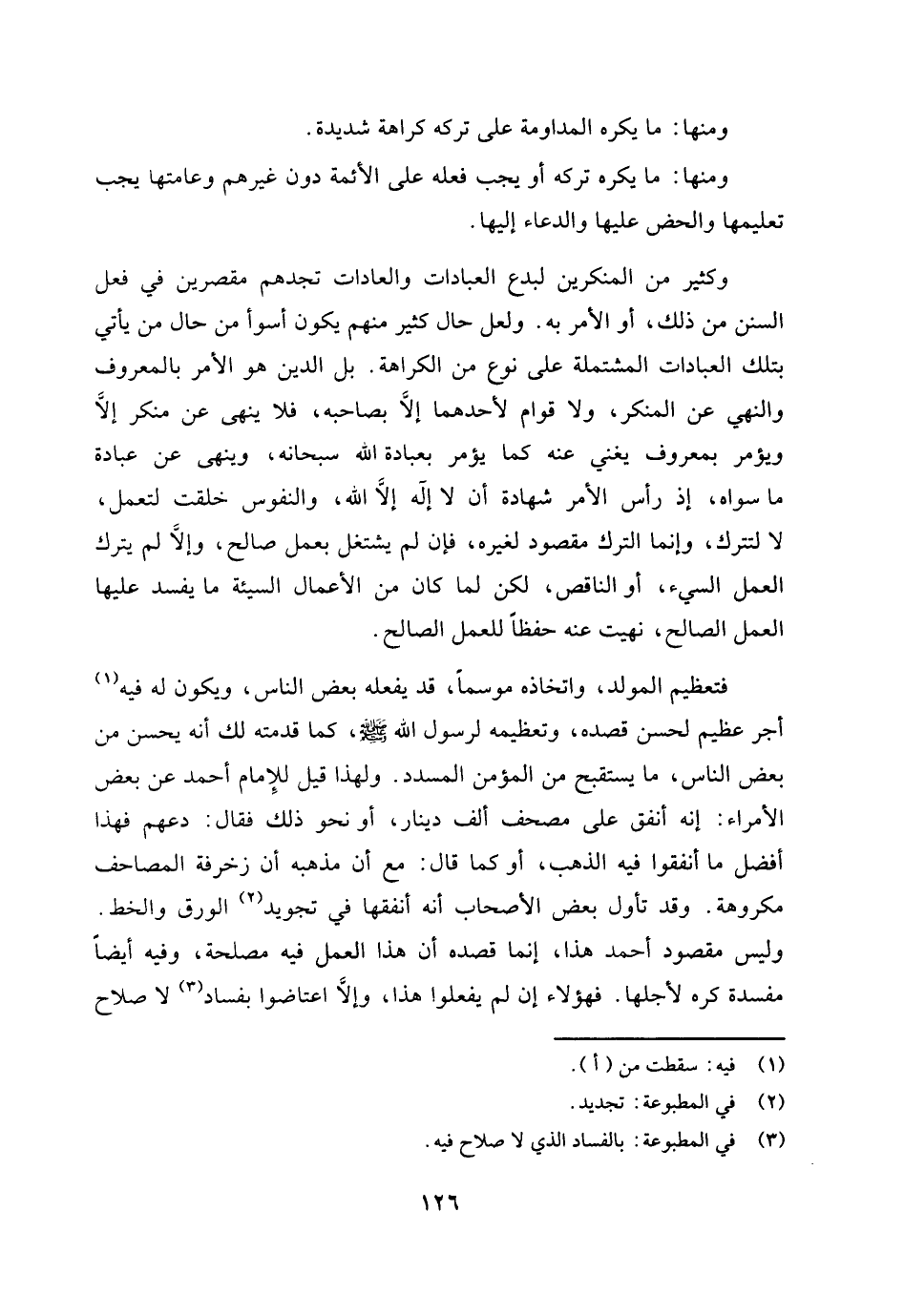 وكثير من المنكرين لبدع العبادات والعادات تجدهم مقصرين في فعل السنن من ذلك، أو الأمر به. ولعل حال كثير منهم يكون أسوأ من حال من يأتي بتلك العبادات المشتملة على نوع من الكراهة. بل الدين هو الأمر بالمعروف والنهي عن المنكر، ولا قوام لأحدهما إلا بصاحبه، فلا ينهى عن منكر إلا ويؤمر بمعروف يغني عنه كما يؤمر بعبادة الله سبحانه، وينهى عن عبادة ما سواه، إذ رأس الأمر شهادة أن لا إله إلا الله، والنفوس خلقت لتعمل، لا لتترك، وإنما الترك مقصود لغيره، فإن لم يشتغل بعمل صالح، وإلا لم يترك العلم السيئ، أو الناقص، لكن لما كان من الأعمال السيئة ما يفسد عليها العمل الصالح، نهيت عنه حفظًا للعمل الصالح.