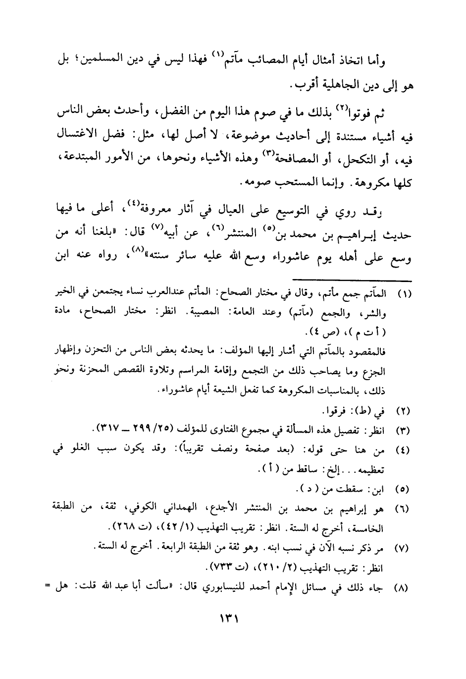 (¬8) جاء ذلك في مسائل الإمام أحمد للنيسابوري قال: (سألت أبا عبد الله قلت: هل سمعت في الحديث أنه من وسع على عياله في يوم عاشوراء وسع الله عليه سائر السنة؟ قال: نعم، شيء رواه سفيان عن جعفر الأحمر، عن إبراهيم بن محمد بن المنتشر. قال سفيان ـ وكان من أفضل من رأينا ـ أن بلغه (أنه من وسع على عياله يوم عاشوراء وسع الله عليه سائر سنته) . انظر: مسائل الإمام أحمد للنيسابوري (1 / 136، 137) ، وذكره المؤلف في مجموع الفتاوى (25 / 300) ، وقال بأنه: (حديث موضوع مكذوب) .