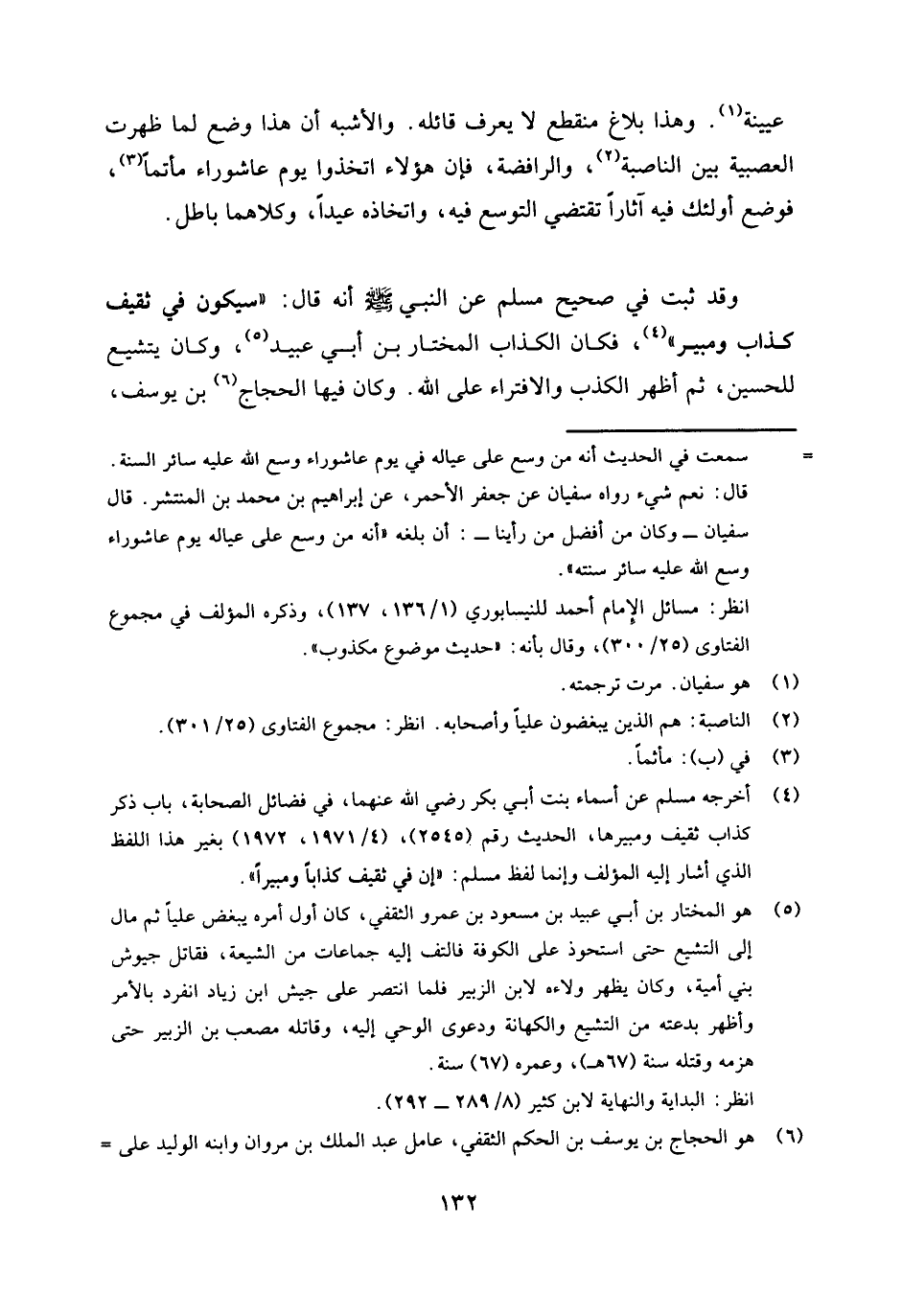 (¬6) هو: المختار بن أبي عبيد بن مسعود بن عمرو الثقفي، كان أول أمره يبغض عليًا ثم مال إلى التشيع حتى استحوذ على الكوفة فالتف إليه جماعات من الشيعة، فقاتل جيوش بني أمية، وكان يظهر ولاءه لابن الزبير فلما انتصر على جيش ابن زياد انفرد بالأمر وأظهر بدعته من التشيع والكهانة ودعوى الوحي إليه، وقاتله مصعب بن الزبير حتى هزمه وقتله سنة (67) ، وعمره (67) سنة. انظر: البداية والنهاية لابن كثير (8 / 289 ـ 292) .