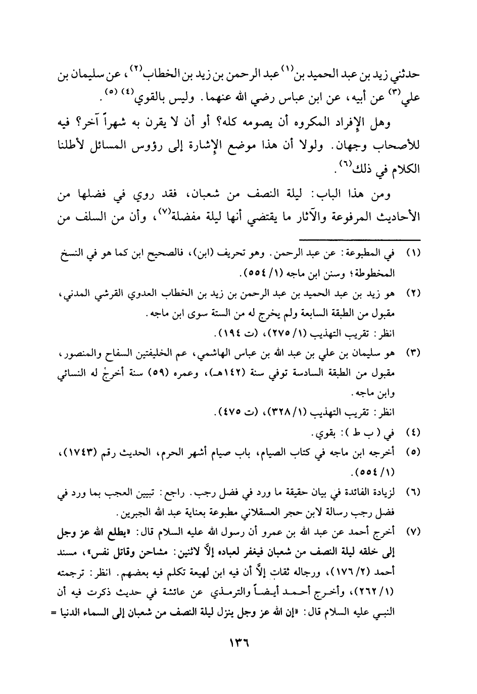 (¬5) لزيادة الفائدة في بيان حقيقة ما ورد في فضل رجب. راجع: تبيين العجب بما ورد في فضل رجب، رسالة لابن حجر العسقلاني مطبوعة بعناية عبد الله الجبرين.
