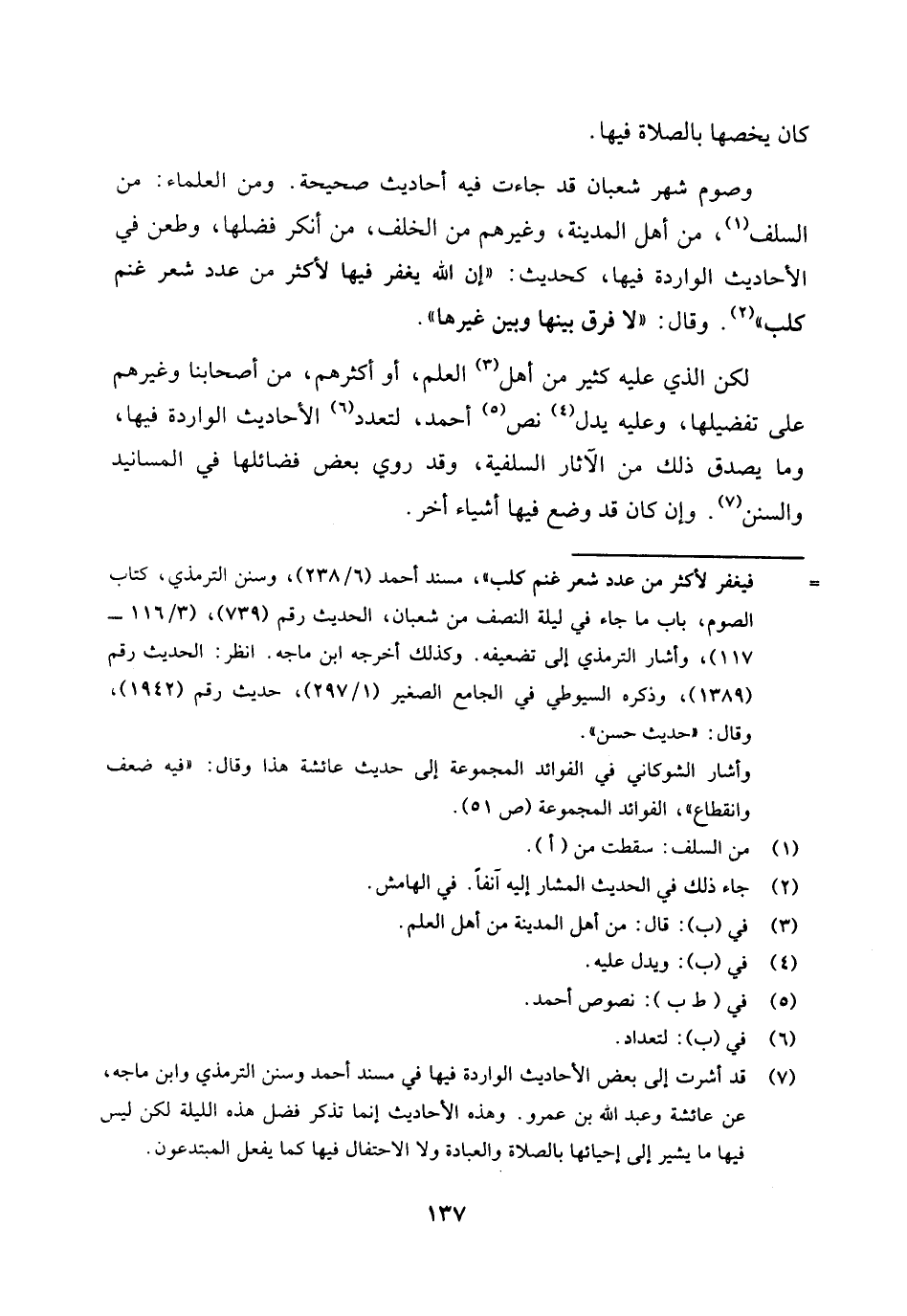 (¬7) قد أشرت إلى بعض الأحاديث الواردة فيها في مسند أحمد وسنن الترمذي وابن ماجه، عن عائشة وعبد الله بن عمرو. وهذه الأحاديث إنما تذكر فضل هذه الليلة لكن ليس فيها ما يشير إلى إحيائها بالصلاة والعبادة ولا الاحتفال فيها كما يفعل المبتدعون.