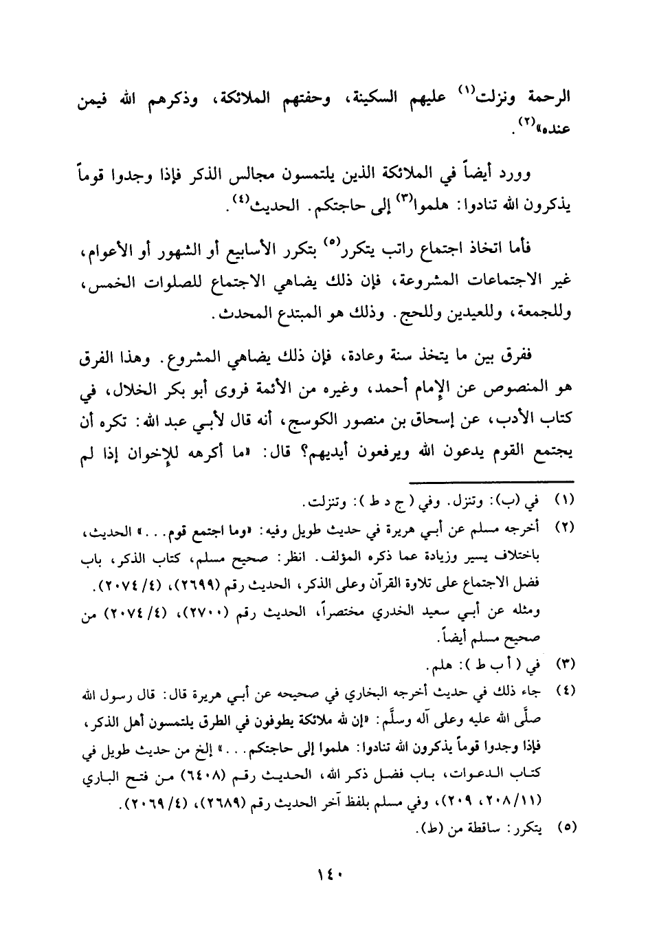 ففرق بين ما يتخذ سنة وعادة، فإن ذلك يضاهي المشروع. وهذا الفرق هو المنصوص عن الإمام أحمد، وغيره من الأئمة فروى أبو بكر الخلال، في كتاب الأدب، عن إسحاق بن منصور الكوسج، أنه قال لأبي عبد الله: تكره أن يجتمع القوم يدعون الله ويرفعون أيديهم؟ قال: "ما أكرهه للإخوان إذا لم