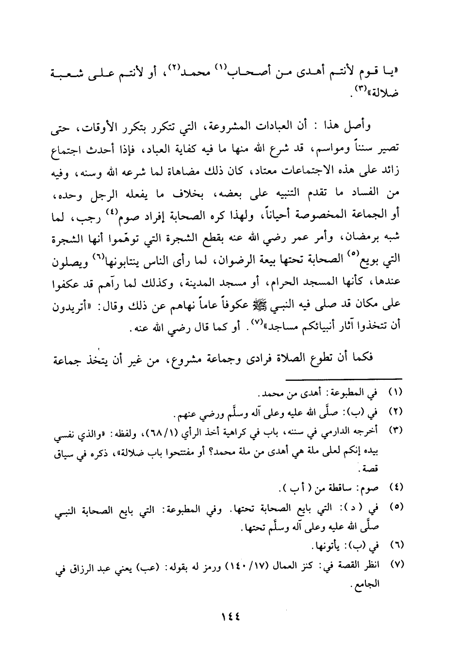 وأصل هذا: أن العبادات المشروعة التي تتكرر بتكرر الأوقات، حتى تصير سننا ومواسم، قد شرع الله منها ما فيه كفاية العباد، فإذا أحدث اجتماع زائد على هذه الاجتماعات معتاد، كان ذلك مضاهاة لما شرعه الله وسنه. وفيه من الفساد ما تقدم التنبيه على بعضه، بخلاف ما يفعله الرجل وحده، أو الجماعة المخصوصة أحيانا، ولهذا كره الصحابة إفراد صوم (¬4) رجب، لما شبه برمضان، وأمر عمر رضي الله عنه بقطع الشجرة التي توهموا أنها الشجرة التي بويع (¬5) الصحابة تحتها بيعة الرضوان. لما رأى الناس ينتابونها (¬6) ويصلون عندها، كأنها المسجد الحرام، أو مسجد المدينة، وكذلك لما رآهم قد عكفوا على مكان قد صلى فيه النبي صلى الله عليه وسلم عكوفا عاما نهاهم عن ذلك، وقال: "أتريدون أن تتخذوا آثار أنبيائكم مساجد؟ " (¬7) . أو كما قال رضي الله عنه.