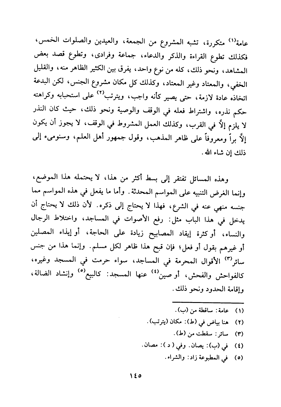 عامة (¬1) متكررة، تشبه المشروع من الجمعة، والعيدين والصلوات الخمس، فكذلك تطوع القراءة والذكر والدعاء، جماعة وفرادى، وتطوع قصد بعض المشاهد، ونحو ذلك، كله من نوع واحد، يفرق بين الكثير الظاهر منه، والقليل الخفي، والمعتاد وغير المعتاد، وكذلك كل مكان مشروع الجنس، لكن البدعة اتخاذه عادة لازمة، حتى يصير كأنه واجب، ويترتب (¬2) على استحبابه وكراهته حكم نذره، واشتراط فعله في الوقف والوصية ونحو ذلك، حيث كان النذر لا يلزم إلا في القرب، وكذلك العمل المشروط في الوقف، لا يجوز أن يكون إلا برا ومعروفا على ظاهر المذهب، وقول جمهور أهل العلم. وسنومئ إلى ذلك إن شاء الله.