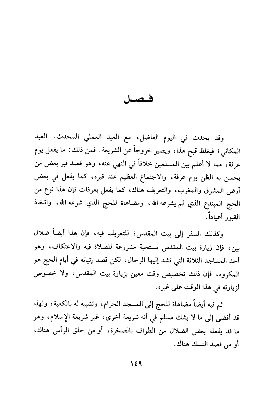 فصل وقد يحدث في اليوم الفاضل، مع العيد العملي المحدث، العيد المكاني، فيغلظ قبح هذا، ويصير خروجا عن الشريعة. فمن ذلك: ما يفعل يوم عرفة، مما لا أعلم بين المسلمين خلافا في النهي عنه، وهو قصد قبر بعض من يحسن به الظن يوم عرفة، والاجتماع العظيم عند قبره، كما يفعل في بعض أرض المشرق والمغرب، والتعريف هناك، كما يفعل بعرفات فإن هذا نوع من الحج المبتدع الذي لم يشرعه الله، ومضاهاة للحج الذي شرعه الله، واتخاذ القبور أعيادا.