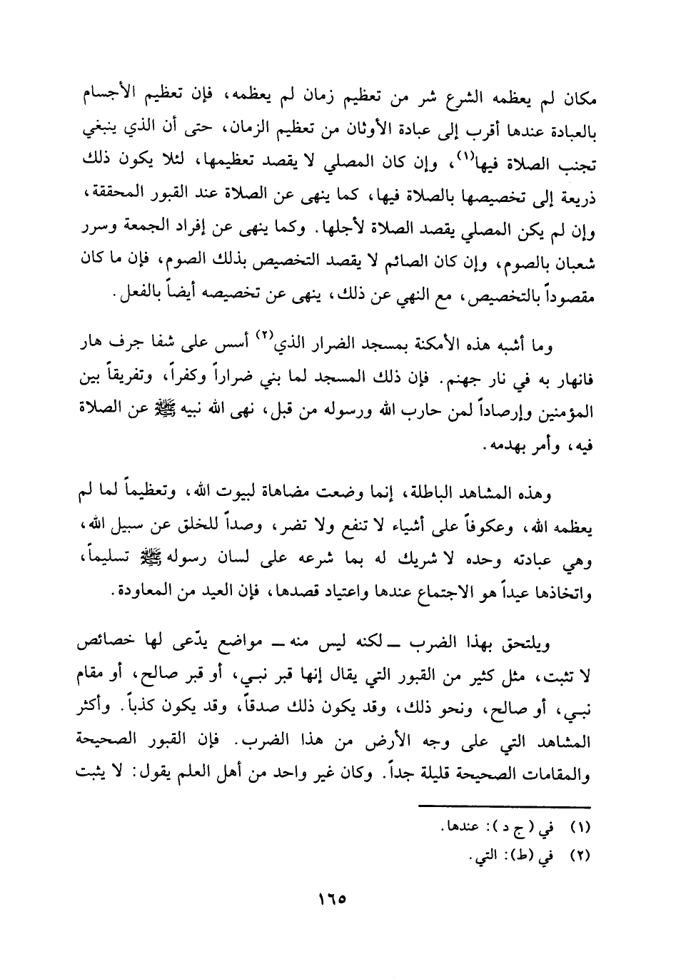 وهذه المشاهد الباطلة إنما وضعت مضاهاة لبيوت الله، وتعظيما لما لم يعظمه الله، وعكوفا على أشياء لا تنفع ولا تضر، وصدًا للخلق عن سبيل الله، وهي عبادته وحده لا شريك له بما شرعه على لسان رسوله صلى الله عليه وسلم تسليما، واتخاذها عيدا هو الاجتماع عندها واعتياد قصدها، فإن العيد من المعاودة.