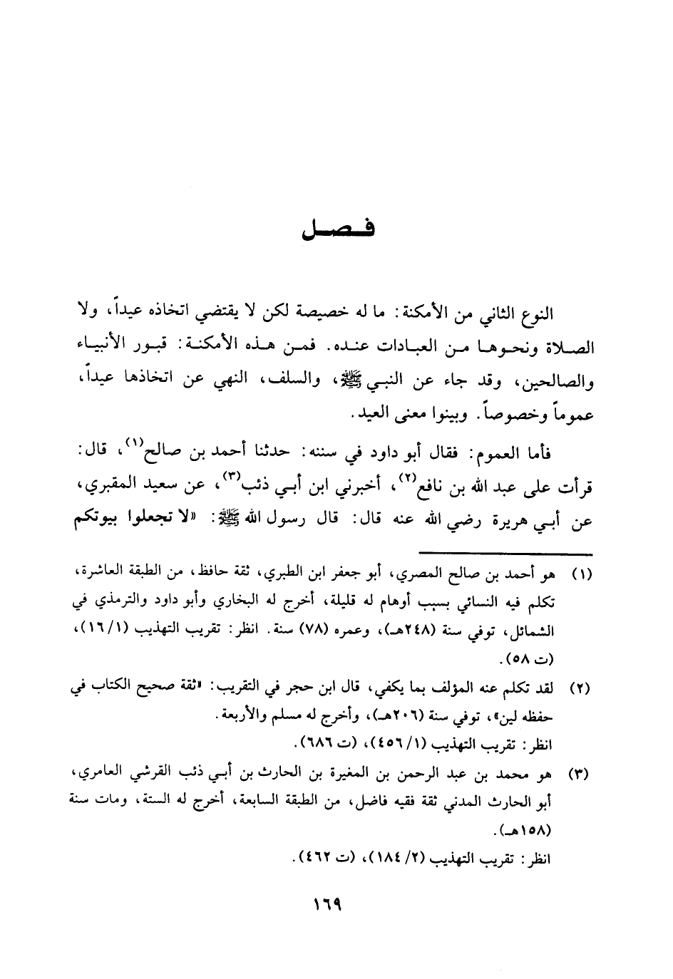 فصل النوع الثاني من الأمكنة: ما له خصيصة لكن لا يقتضي اتخاذه عيدا، ولا الصلاة ونحوها من العبادات عنده. فمن هذه الأمكنة: قبور الأنبياء والصالحين، وقد جاء عن النبي صلى الله عليه وسلم، والسلف النهي عن اتخاذها عيدا، عموما وخصوصا. وبينوا معنى العيد.