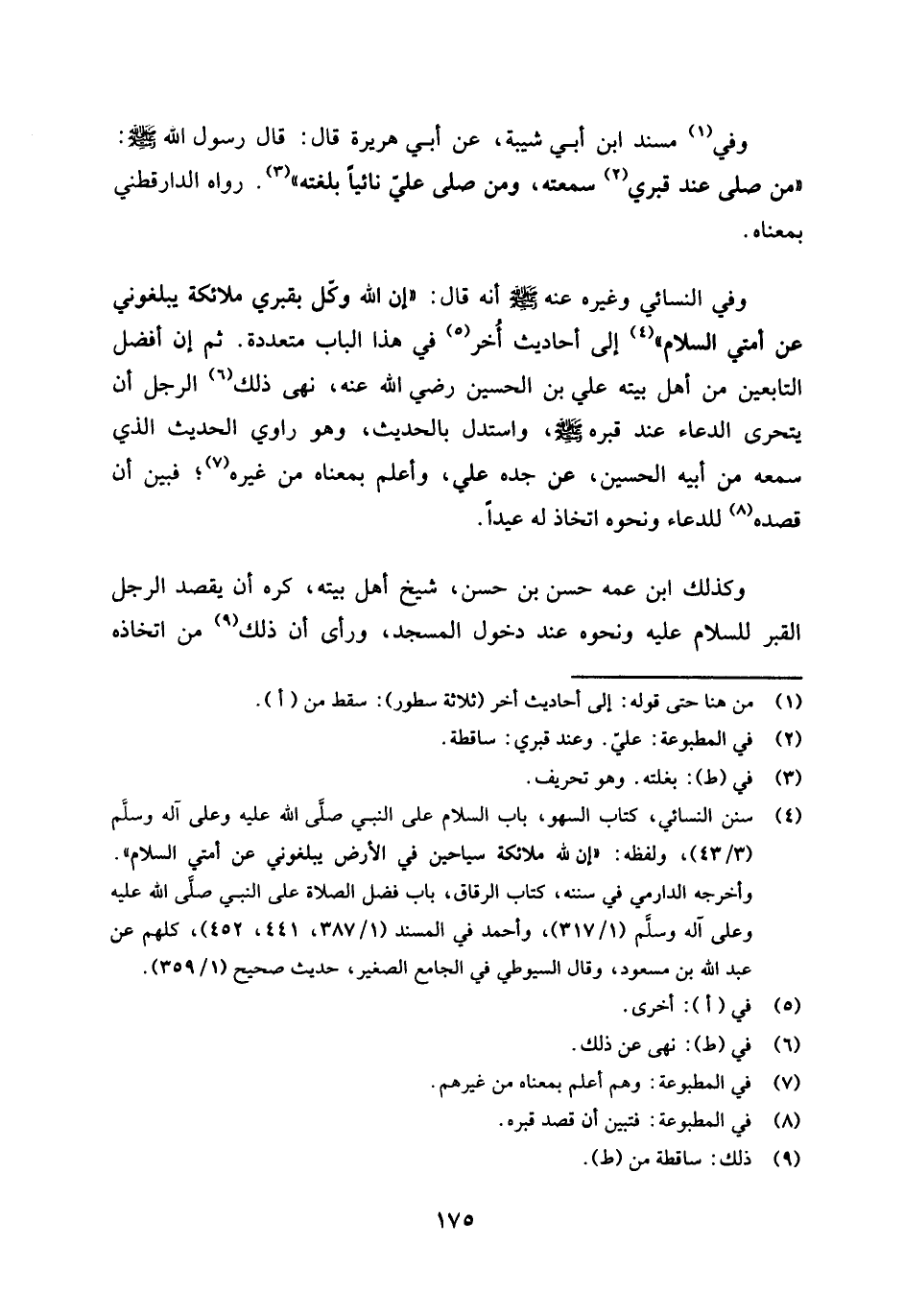 وفي النسائي وغيره عنه صلى الله عليه وسلم أنه قال: «إن الله وكل بقبري ملائكة يبلغوني عن أمتي السلام» (¬4) إلى أحاديث أخر (¬5) في هذا الباب متعددة.