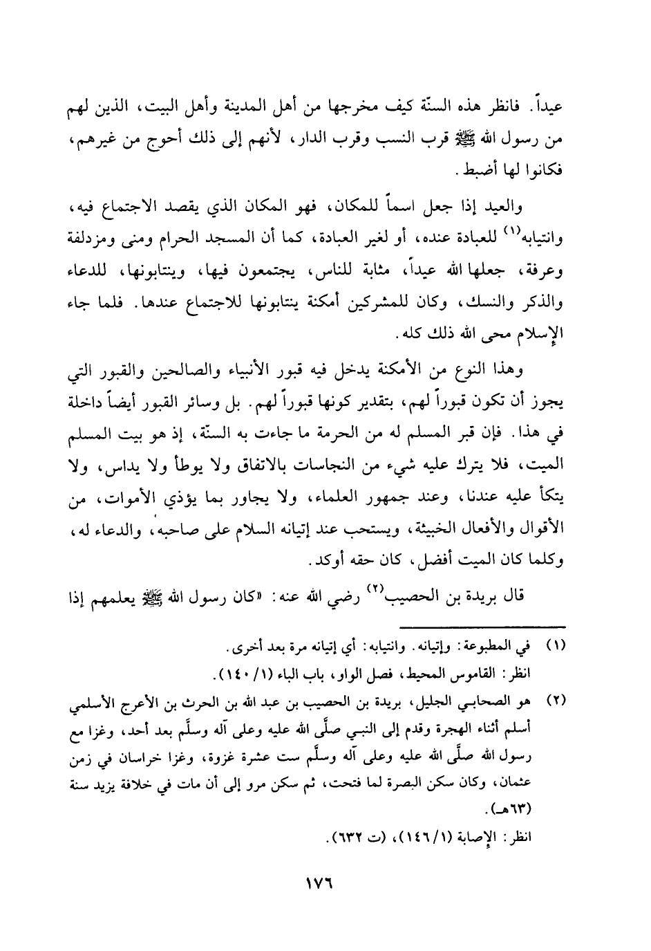 وهذا النوع من الأمكنة يدخل فيه قبور الأنبياء والصالحين والقبور التي يجوز أن تكون قبورًا لهم، بتقدير كونها قبورًا لهم، بل وسائر القبور أيضًا داخلة في هذا. فإن قبر المسلم له من الحرمة ما جاءت به السنة، إذ هو بيت المسلم الميت، فلا يترك عليه شيء من النجاسات بالاتفاق ولا يوطأ ولا يداس، ولا يتكأ عليه عندنا، وعند جمهور العلماء، ولا يجاور بما يؤذي الأموات من الأقوال والأفعال الخبيثة، ويستحب عند إتيانه السلام على صاحبه، والدعاء له، وكلما كان الميت أفضل، كان حقه أوكد.