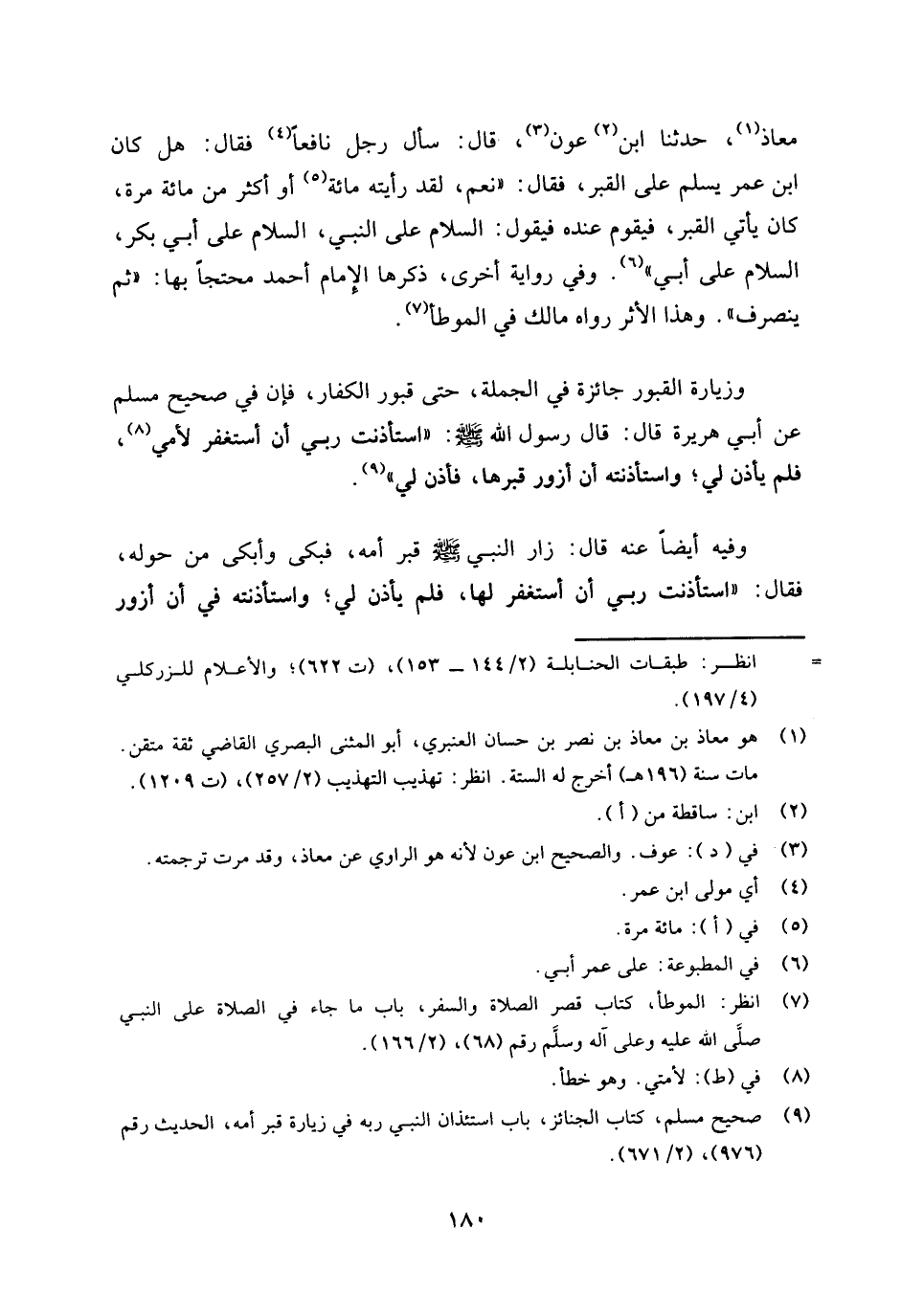معاذ (¬1) حدثنا ابن (¬2) عون (¬3) قال: سأل رجل نافعًا (¬4) فقال: هل كان ابن عمر يسلم على القبر، فقال: نعم، لقد رأيته مائة (¬5) أو أكثر من مائة مرة، كان يأتي القبر، فيقوم عنده فيقول: "السلام على النبي، السلام على أبي بكر، السلام على أبي" (¬6) . وفي رواية أخرى، ذكرها الإمام أحمد محتجًا بها: "ثم ينصرف"، وهذا الأثر رواه مالك في الموطأ (¬7) .
