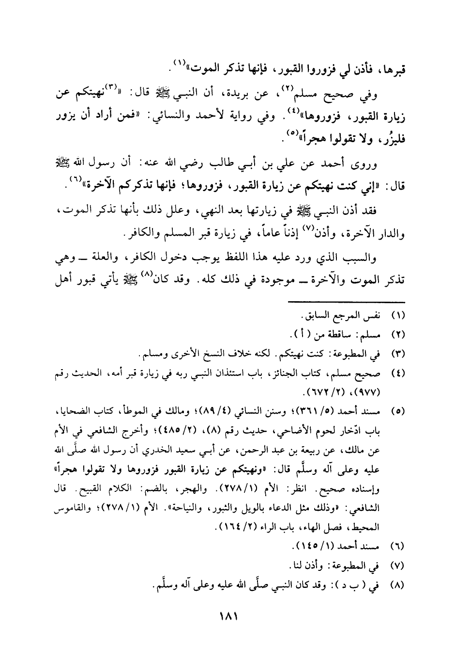 وفي صحيح مسلم (¬2) عن بريدة، " أن النبي صلى الله عليه وسلم قال: " (¬3) «نهيتكم عن زيارة القبور فزوروها» (¬4) . وفي رواية لأحمد والنسائي: «فمن أراد أن يزور فليزر ولا تقولوا هجرًا» (¬5) .
