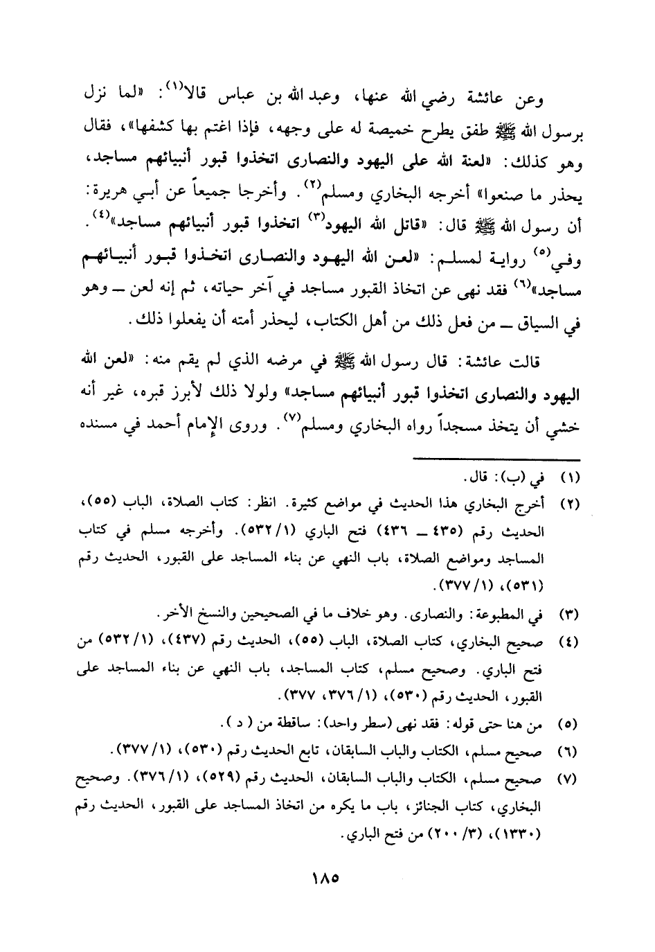 (¬4) صحيح البخاري، كتاب الصلاة، الباب (55) ، الحديث رقم (437) ، (1 / 532) من فتح الباري. وصحيح مسلم، وكتاب المساجد، باب النهى عن بناء المساجد على القبور، الحديث رقم (530) ، (1 / 376، 377) .