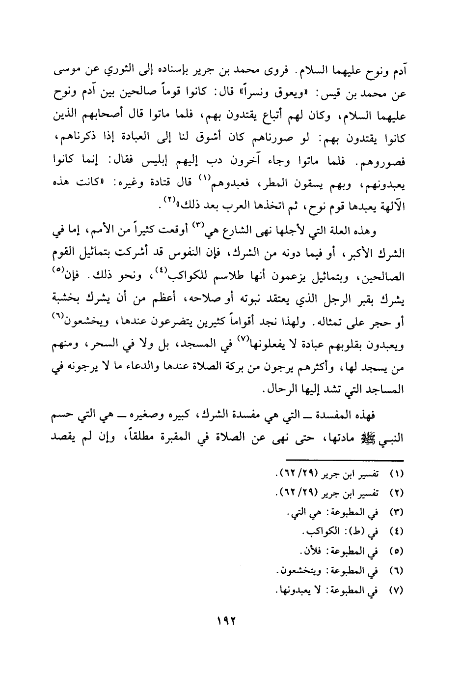 وهذه العلة التي لأجلها نهى الشارع هي (¬3) أوقعت كثيرا من الأمم، إما في الشرك الأكبر، أو فيما دونه من الشرك، فإن النفوس قد أشركت بتماثيل القوم الصالحين، وبتماثيل يزعمون أنها طلاسم للكواكب (¬4) ونحو ذلك.