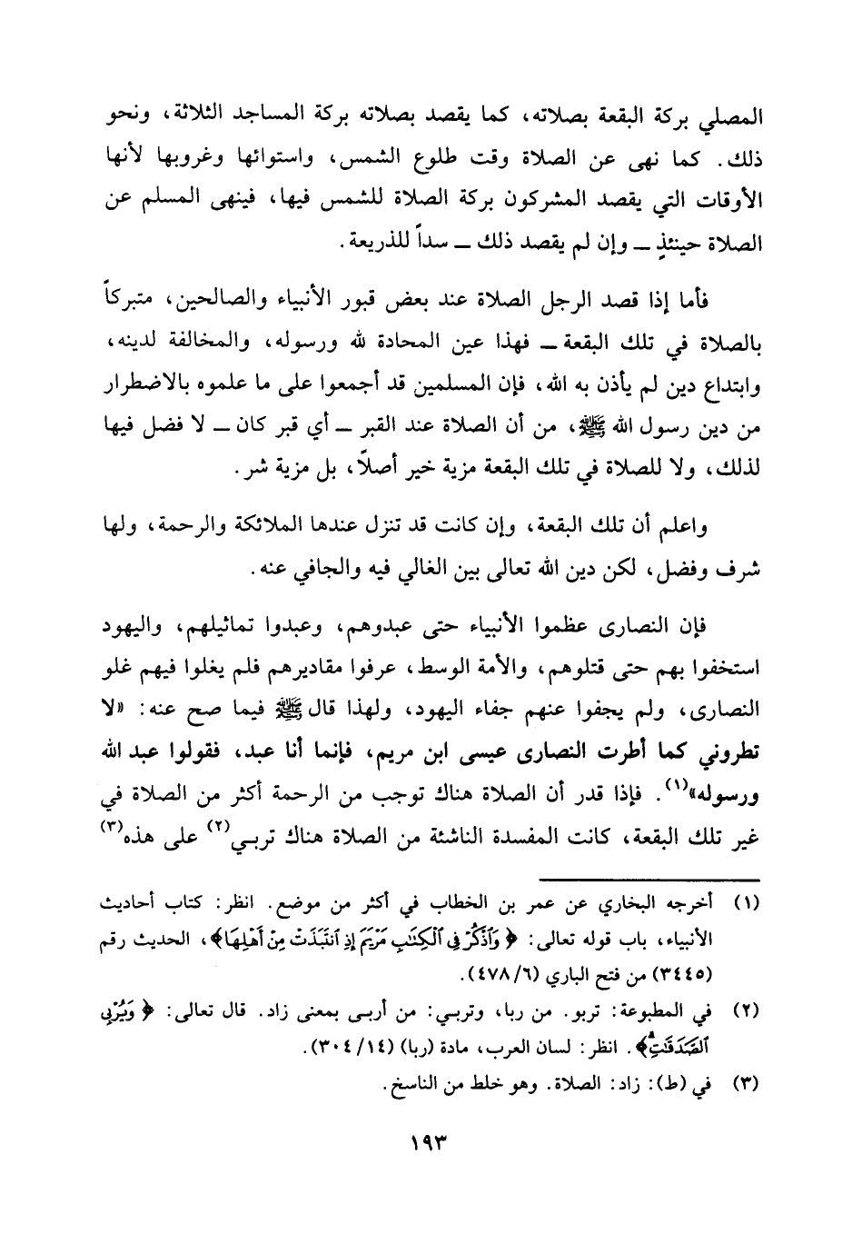 فإن النصارى عظموا الأنبياء حتى عبدوهم، وعبدوا تماثيلهم، واليهود استخفوا بهم حتى قتلوهم، والأمة الوسط عرفوا مقاديرهم؛ فلم يغلوا فيهم غلو النصارى، ولم يجفوا عنهم جفاء اليهود، ولهذا قال صلى الله عليه وسلم فيما صح عنه: «لا تطروني كما أطرت النصارى عيسى ابن مريم، فإنما أنا عبد، فقولوا: عبد الله ورسوله» (¬1) . فإذا قدر أن الصلاة هناك توجب من الرحمة أكثر من الصلاة في غير تلك البقعة كانت المفسدة الناشئة من الصلاة هناك تربي (¬2) . على هذه (¬3) .
