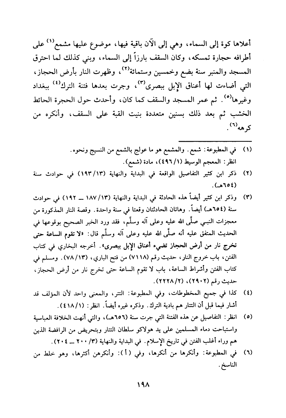 (¬3) وذكر ابن كثير أيضا هذه الحادثة في البداية والنهاية (13 / 187 - 192) في حوادث سنة (654هـ) أيضا، وهاتان الحادثتان وقعتا في سنة واحدة، وقصة النار المذكورة من معجزات النبي صلى الله عليه وعلى آله وسلم، فقد ورد الخبر الصحيح بوقوعها في الحديث المتفق عليه أنه صلى الله عليه وعلى آله وسلم قال: " لا تقوم الساعة حتى تخرج نار من أرض الحجاز تضيء أعناق الإبل ببصرى ". أخرجه البخاري في كتاب الفتن، باب خروج النار، حديث رقم (7118) من فتح الباري، (13 / 78) . ومسلم في كتاب الفتن وأشراط الساعة، باب لا تقوم الساعة حتى تخرج نار من أرض الحجاز، حديث رقم (2902) ، (2 / 2228) .