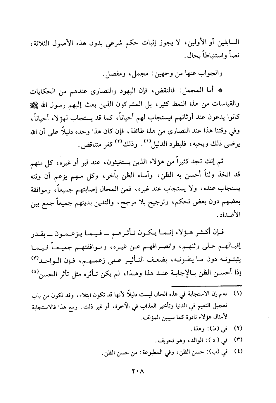 * أما المجمل: فالنقض: فإن اليهود والنصارى عندهم من الحكايات والقياسات من هذا النمط كثير، بل المشركون الذين بعث إليهم رسول الله صلى الله عليه وسلم كانوا يدعون عند أوثانهم فيستجاب لهم أحيانا، كما قد يستجاب لهؤلاء أحيانا، وفي وقتنا هذا عند النصارى من هذا طائفة، فإن كان هذا وحده دليلا على أن الله يرضى ذلك ويحبه، فليطرد الدليل (¬1) . وذلك (¬2) كفر متناقض.