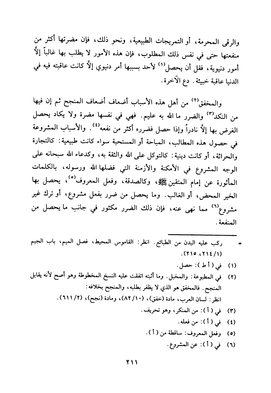 والمخفق (¬2) من أهل هذه الأسباب أضعاف أضعاف المنجح، ثم إن فيها من النكد (¬3) والضرر ما الله به عليم. فهي في نفسها مضرة ولا يكاد يحصل الغرض بها إلا نادرا وإذا حصل فضرره أكثر من نفعه (¬4) . والأسباب المشروعة في حصول هذه المطالب، المباحة أو المستحبة سواء كانت طبيعية: كالتجارة والحراثة، أو كانت دينية: كالتوكل على الله والثقة به، وكدعاء الله سبحانه على الوجه المشروع، في الأمكنة والأزمنة التي فضلها الله ورسوله، بالكلمات المأثورة عن إمام المتقين صلى الله عليه وسلم، وكالصدقة، وفعل المعروف (¬5) يحصل بها الخير المحض أو الغالب. وما يحصل من ضرر بفعل مشروع، أو ترك غير مشروع (¬6) مما نهي عنه، فإن ذلك الضرر مكثور في جانب ما يحصل من المنفعة.