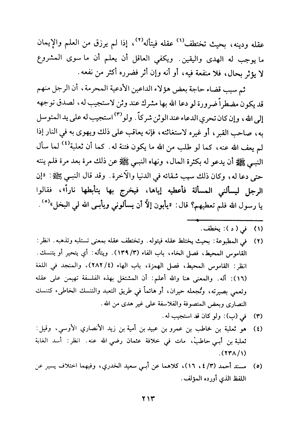ثم سبب قضاء حاجة بعض هؤلاء الداعين الأدعية المحرمة: أن الرجل منهم قد يكون مضطرًّا ضرورة لو دعا الله بها مشرك عند وثن لاستجيب له، لصدق توجهه إلى الله، وإن كان تحري الدعاء عند الوثن شركا. ولو (¬3) استجيب له على يد المتوسل به، صاحب القبر أو غيره لاستغاثته، فإنه يعاقب على ذلك ويهوي به في النار إذا لم يعف الله عنه، كما لو طلب من الله ما يكون فتنة له. كما أن ثعلبة (¬4) لما سأل النبي صلى الله عليه وسلم أن يدعو له بكثرة المال، ونهاه النبي صلى الله عليه وسلم عن ذلك مرة بعد مرة فلم ينته حتى دعا له، وكان ذلك سبب شقائه في الدنيا والآخرة. وقد " قال النبي صلى الله عليه وسلم: «إن الرجل ليسألني المسألة فأعطيه إياها، فيخرج بها يتأبطها نارا "، فقالوا: يا رسول الله فلم تعطيهم؟ قال: " يأبون إلا أن يسألوني ويأبى الله لي البخل» (¬5) .