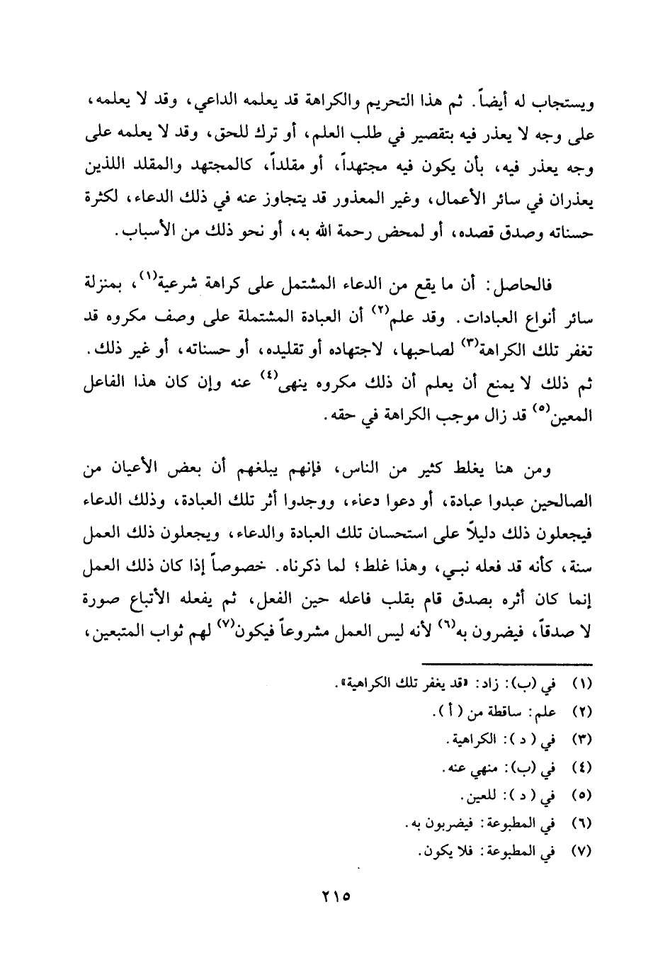 فالحاصل: أن ما يقع من الدعاء المشتمل على كراهة شرعية (¬1) بمنزلة سائر أنواع العبادات. وقد علم (¬2) أن العبادة المشتملة على وصف مكروه قد تغفر تلك الكراهة (¬3) لصاحبها، لاجتهاده أو تقليده، أو حسناته أو غير ذلك. ثم ذلك لا يمنع أن يعلم أن ذلك مكروه ينهى (¬4) عنه، وإن كان هذا الفاعل المعين (¬5) قد زال موجب الكراهة في حقه.