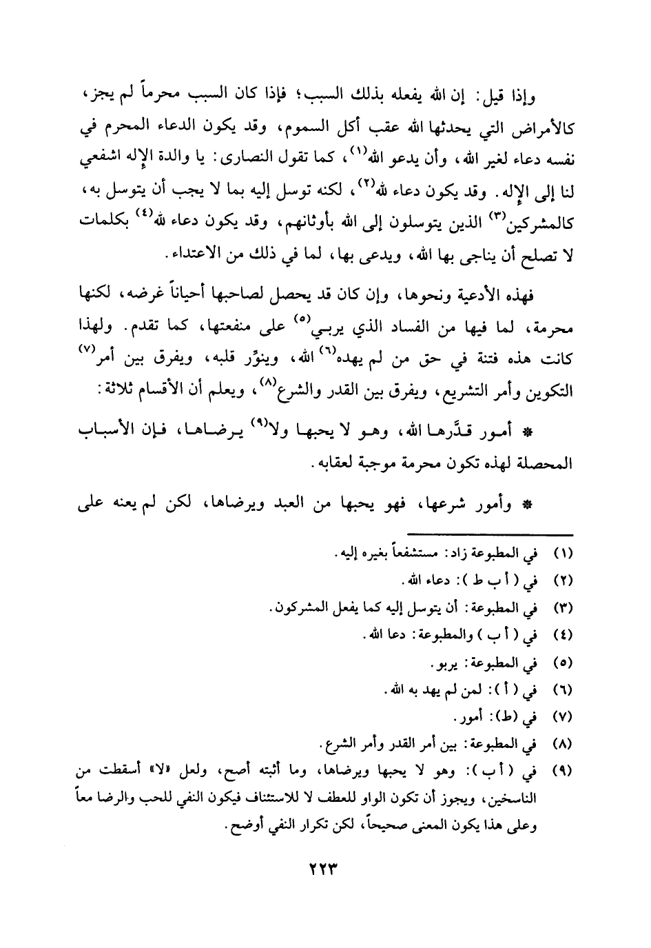وإذا قيل: إن الله يفعله بذلك السبب، فإذا كان السبب محرما لم يجز، كالأمراض التي يحدثها الله عقب أكل السموم، وقد يكون الدعاء المحرم في نفسه دعاء لغير الله، وأن يدعو الله (¬1) كما تقول النصارى: يا والدة الإله اشفعي لنا إلى الإله. وقد يكون دعاء لله (¬2) لكنه توسل إليه بما لا يُحب أن يتوسل به، كالمشركين (¬3) الذين يتوسلون إلى الله بأوثانهم، وقد يكون دعاء لله (¬4) بكلمات لا تصلح أن يناجى بها الله، ويدعى بها، لما في ذلك من الاعتداء.