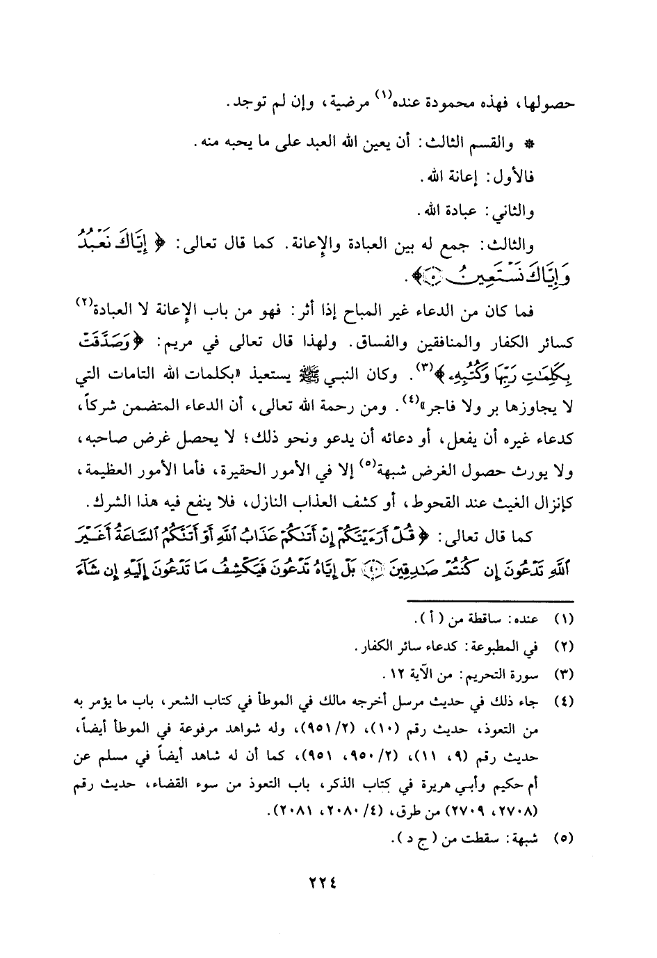 فما كان من الدعاء غير المباح إذا أثر: فهو من باب الإعانة لا العبادة (¬2) كسائر الكفار والمنافقين والفساق. ولهذا قال تعالى في مريم: {وَصَدَّقَتْ بِكَلِمَاتِ رَبِّهَا وَكُتُبِهِ} [التحريم: 12] (¬3) «وكان النبي صلى الله عليه وسلم يستعيذ " بكلمات الله التامات التي لا يجاوزها بر ولا فاجر» (¬4) .