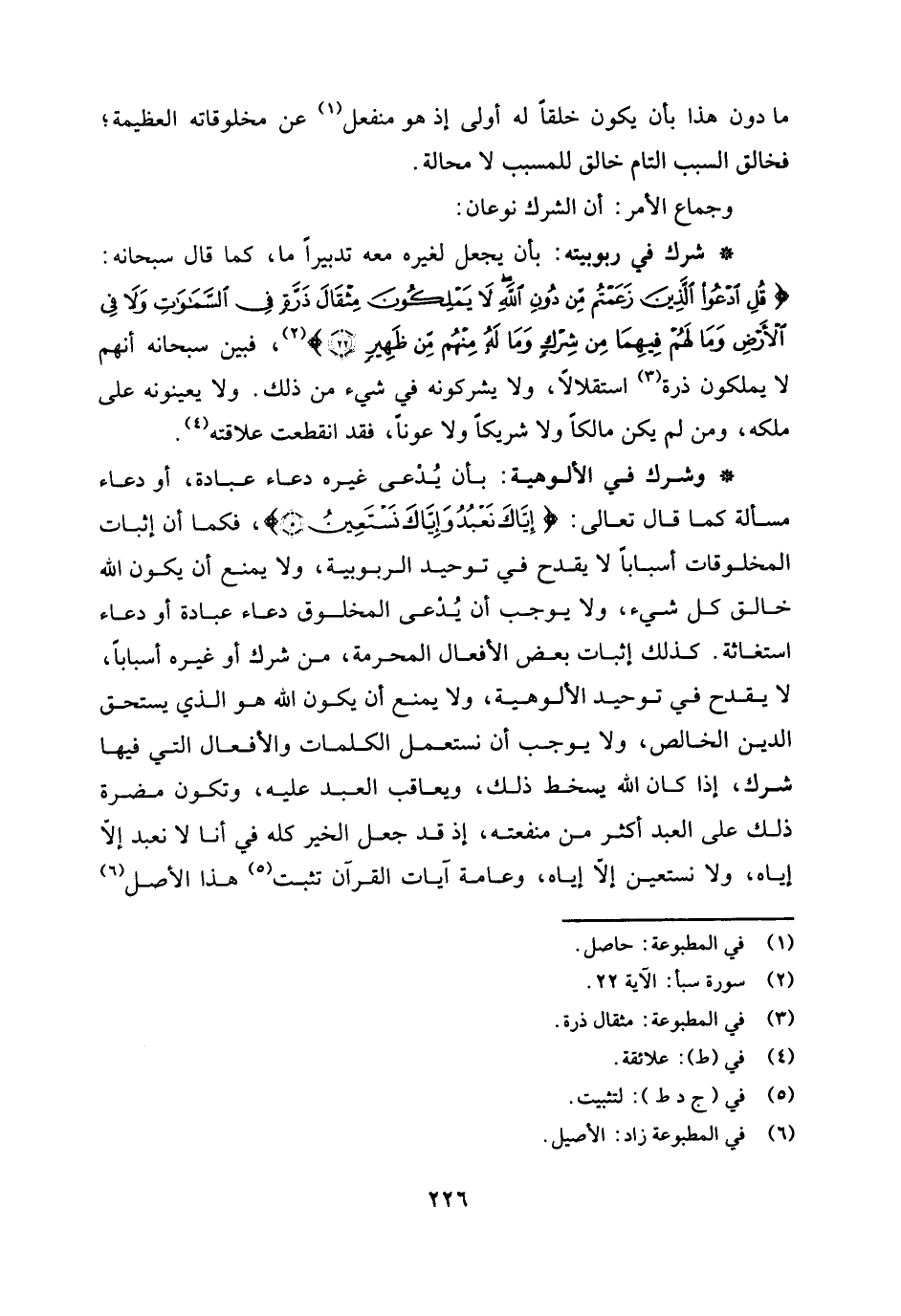 * وشرك في الألوهية: بأن يدعى غيره دعاء عبادة، أو دعاء مسألة كما قال تعالى: {إِيَّاكَ نَعْبُدُ وَإِيَّاكَ نَسْتَعِينُ} [الفاتحة: 5] فكما أن إثبات المخلوقات أسبابًا لا يقدح في توحيد الربوبية، ولا يمنع أن يكون الله خالق كل شيء، ولا يوجب أن يدعى المخلوق دعاء عبادة أو دعاء استغاثة. كذلك إثبات بعض الأفعال المحرمة، من شرك أو غيره أسبابا، لا يقدح في توحيد الألوهية، ولا يمنع أن يكون الله هو الذي يستحق الدين الخالص، ولا يوجب أن نستعمل الكلمات والأفعال التي فيها شرك، إذا كان الله يسخط ذلك، ويعاقب العبد عليه، وتكون مضرة ذلك على العبد أكثر من منفعته، إذ قد جعل الخير كله في أنا لا نعبد إلا إياه، ولا نسعتين إلا إياه.