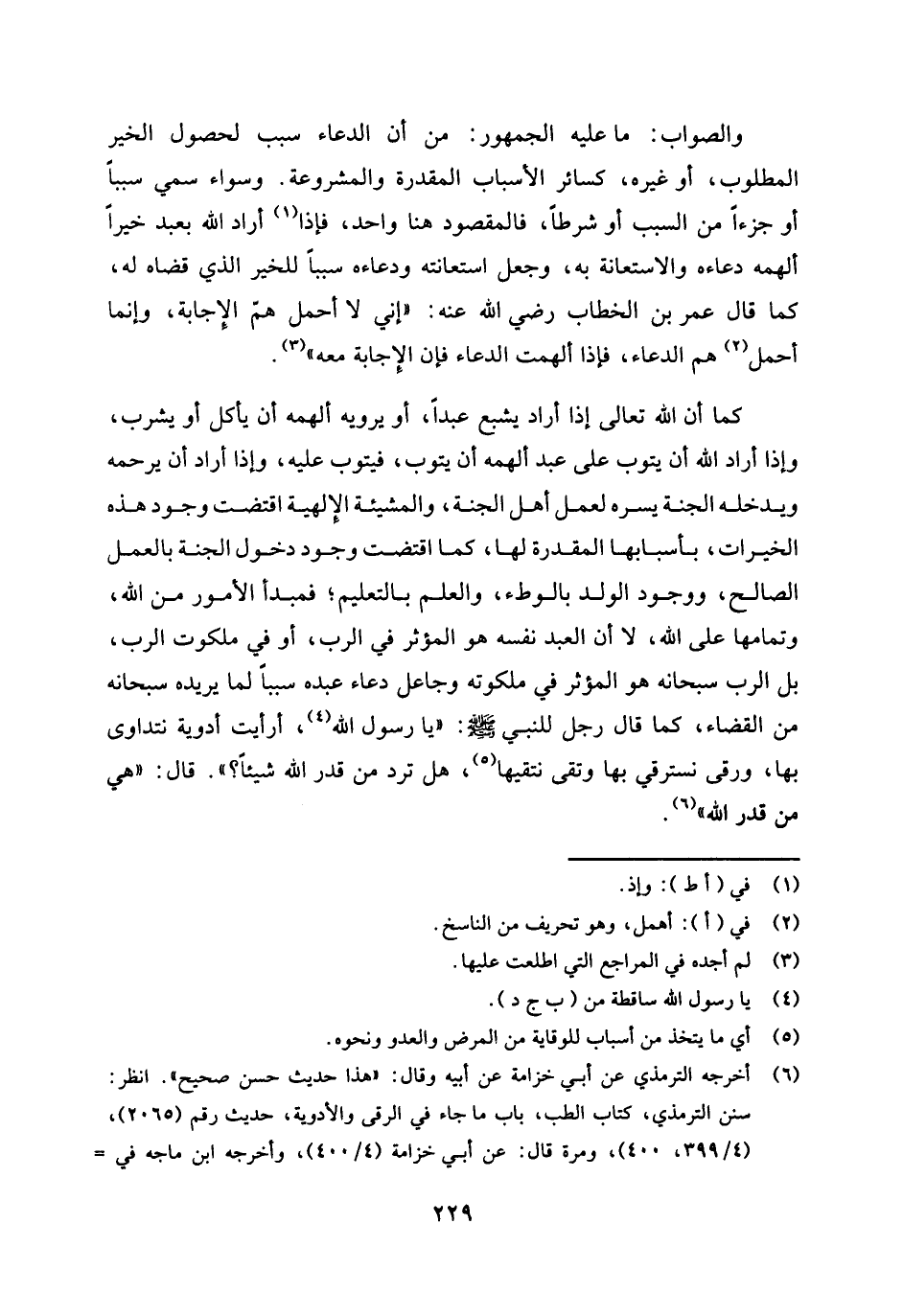 فمبدأ الأمور من الله، وتمامها على الله، لا أن العبد نفسه هو المؤثر في الرب، أو في ملكوت الرب، بل الرب سبحانه هو المؤثر في ملكوته وجاعل دعاء عبده سببًا لما يريده سبحانه من القضاء، كما «قال رجل للنبي صلى الله عليه وسلم: يا رسول الله (¬4) أرأيت أدوية نتداوى بها، ورقى نسترقي بها وتقى نتقيها (¬5) هل ترد من قدر الله شيئا؟ قال: هي من قدر الله» (¬6) .