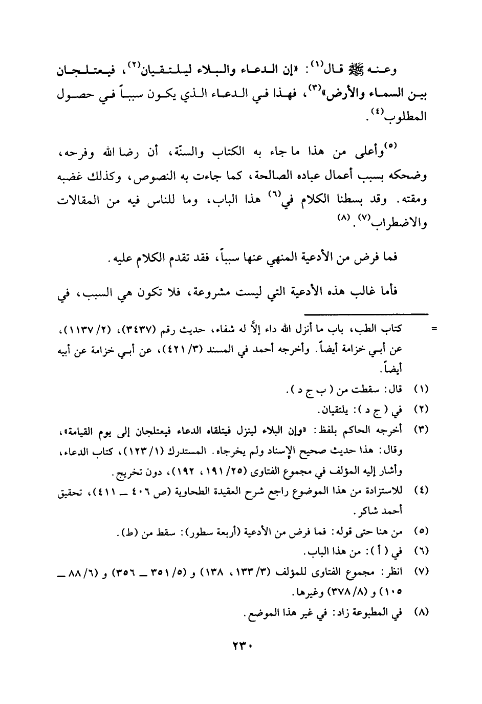 (¬3) أخرجه الحاكم بلفظ: " وإن البلاء لينزل فيتلقاه الدعاء فيعتلجان إلى يوم القيامة "، وقال: هذا حديث صحيح الإسناد ولم يخرجاه. المستدرك (1 / 123) ، كتاب الدعاء، وأشار إليه المؤلف في مجموع الفتاوى (25 / 191، 192) ، دون تخريج.