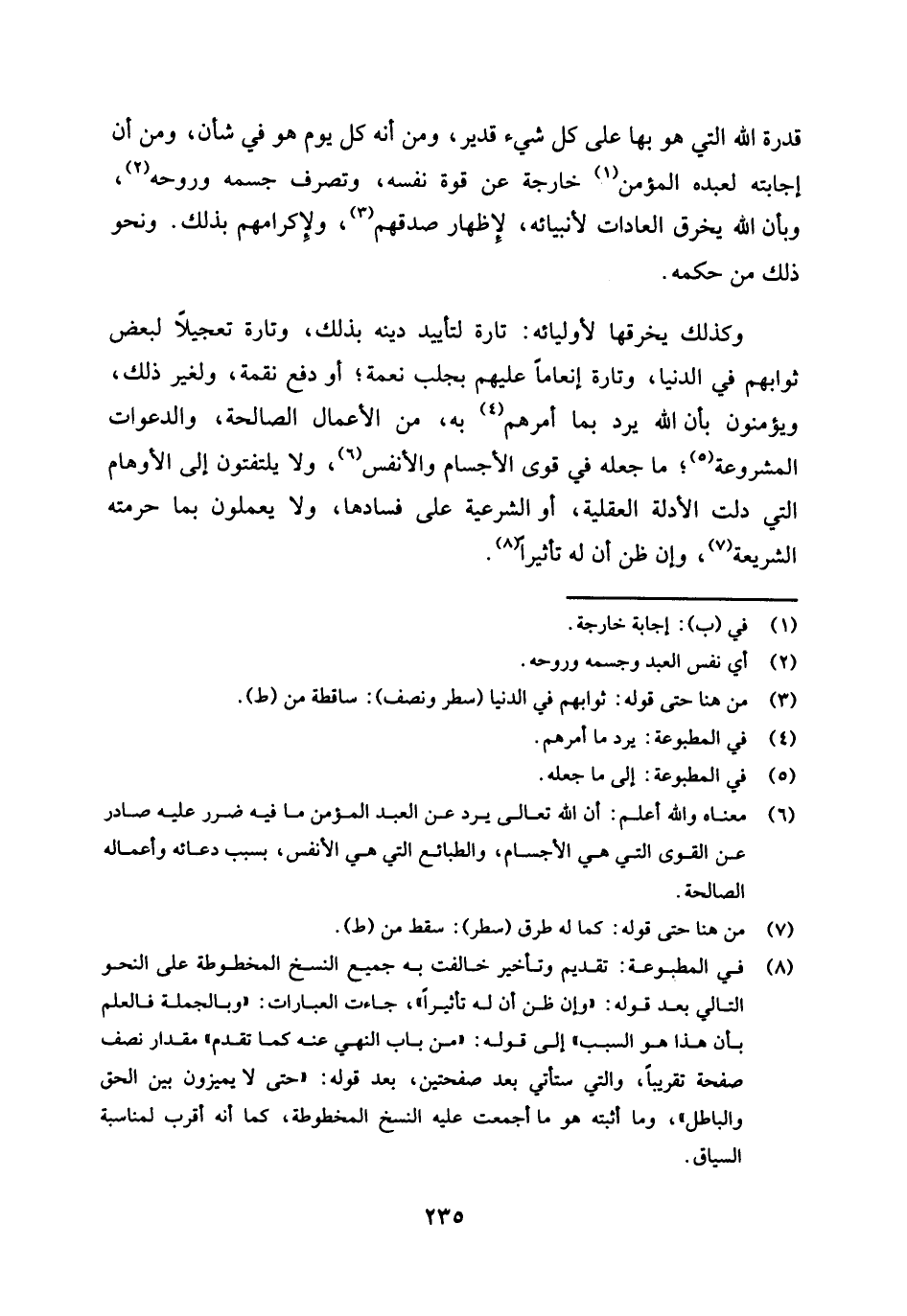 وكذلك يخرقها لأوليائه: تارة لتأييد دينه بذلك، وتارة تعجيلًا لبعض ثوابهم في الدنيا، وتارة إنعامًا عليهم بجلب نعمة، أو دفع نقمة، ولغير ذلك، ويؤمنون بأن الله يرد بما أمرهم (¬4) به، من الأعمال الصالحة، والدعوات المشروعة - (¬5) ما جعله في قوى الأجسام والأنفس (¬6) ولا يلتفتون إلى الأوهام التي دلت الأدلة العقلية، أو الشرعية على فسادها، ولا يعملون بما حرمته الشريعة، (¬7) وإن ظن أن له تأثيرًا (¬8) .