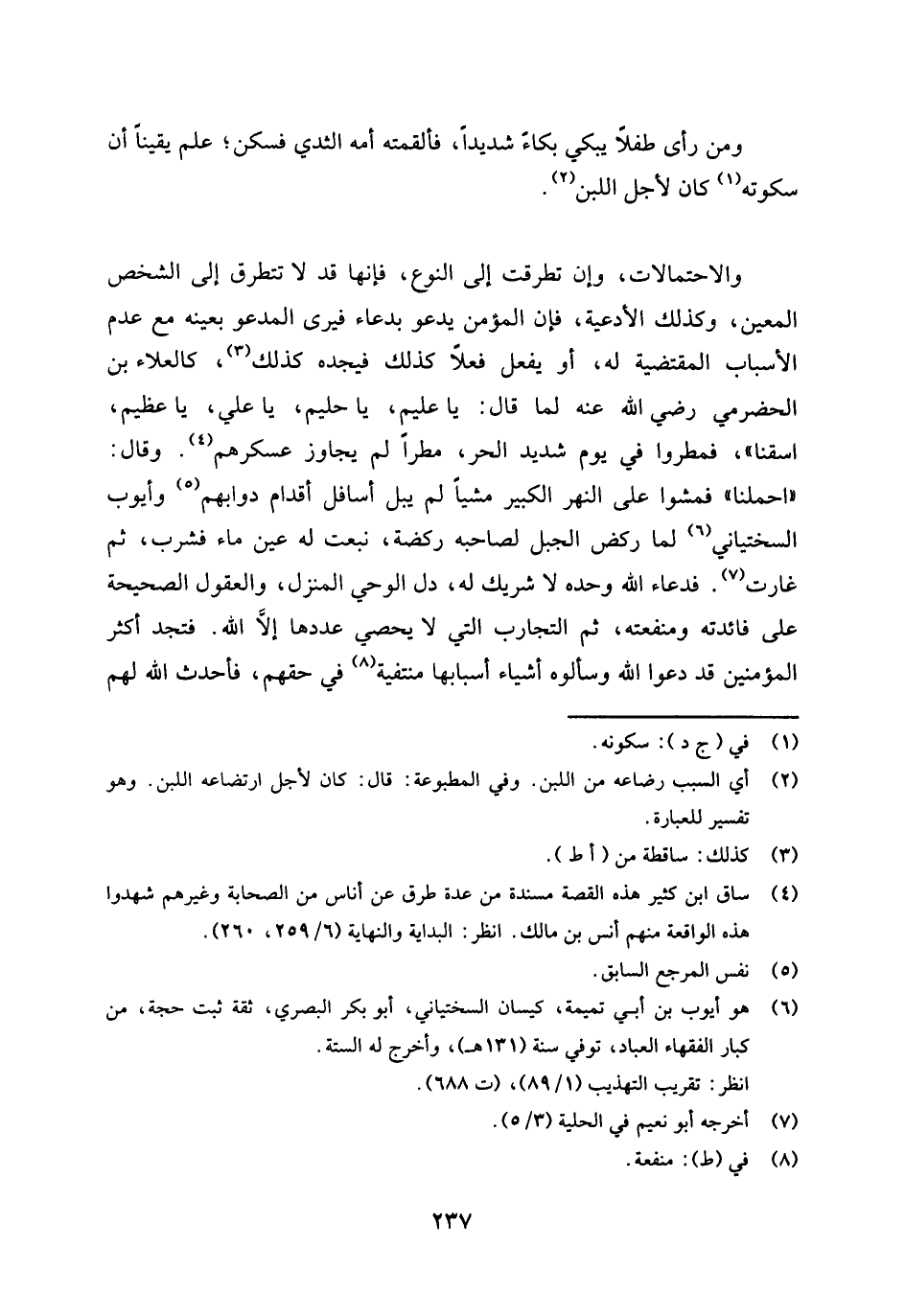 والاحتمالات، وإن تطرقت إلى النوع، فإنها قد لا تتطرق إلى الشخص المعين. وكذلك الأدعية، فإن المؤمن يدعو بدعاء فيرى المدعو بعينه مع عدم الأسباب المقتضية له، أو يفعل فعلًا كذلك فيجده كذلك (¬3) كالعلاء بن الحضرمي رضي الله عنه لما قال: يا عليم، يا حليم، يا علي، يا عظيم، اسقنا، فمطروا في يوم شديد الحر، مطرًا لم يجاوز عسكرهم (¬4) . وقال: احملنا فمشوا على النهر الكبير مشيًا لم يبل أسافل أقدام دوابهم (¬5) وأيوب السختياني (¬6) لما ركض الجبل لصاحبه ركضة، نبعت له عين ماء فشرب، ثم غارت (¬7) .