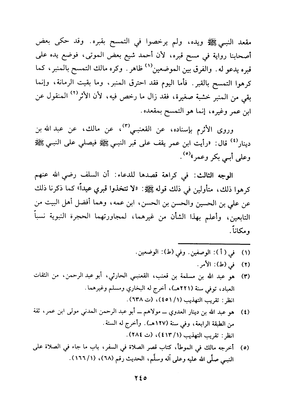 الوجه الثالث: في كراهة قصدها للدعاء: أن السلف رضي الله عنهم كرهوا ذلك، متأولين في ذلك قوله صلى الله عليه وسلم: «لا تتخذوا قبري عيدًا» كما ذكرنا ذلك عن علي بن الحسين والحسن بن الحسن، ابن عمه، وهما أفضل أهل البيت من التابعين، وأعلم بهذا الشأن من غيرهما، لمجاورتهما الحجرة النبوية نسبًا ومكانًا.