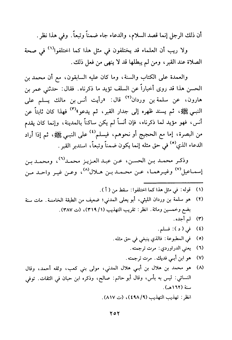 والعمدة على الكتاب والسنة، وما كان عليه السابقون، مع أن محمد بن الحسن هذا قد روى أخبارا عن السلف تؤيد ما ذكرناه. فقال: حدثني عمر بن هارون، عن سلمة بن وردان (¬2) قال: رأيت أنس بن مالك يسلم على النبي صلى الله عليه وسلم، ثم يسند ظهره إلى جدار القبر، ثم يدعو " (¬3) فهذا إن كان ثابتا عن أنس فهو مؤيد لما ذكرناه، فإن أنسا لم يكن ساكنا بالمدينة، وإنما كان يقدم من البصرة، إما مع الحجيج أو نحوهم، فيسلم (¬4) على النبي صلى الله عليه وسلم، ثم إذا أراد الدعاء الذي (¬5) في حق مثله إنما يكون ضمنا وتبعا، استدبر القبر.