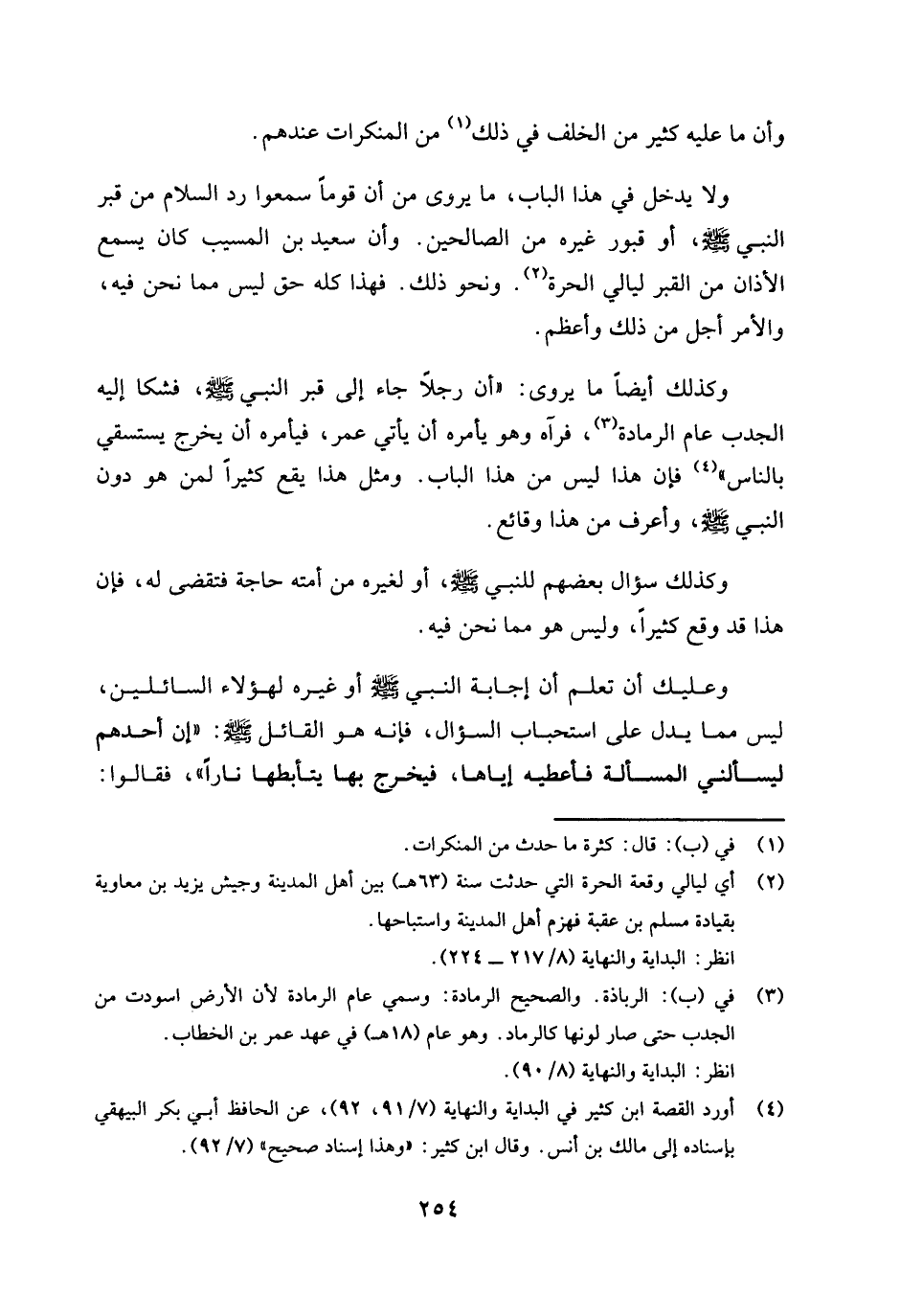وكذلك أيضا ما يروى: " أن رجلا جاء إلى قبر النبي صلى الله عليه وسلم، فشكا إليه الجدب عام الرمادة (¬3) فرآه وهو يأمره أن يأتي عمر، فيأمره أن يخرج يستسقي بالناس " (¬4) فإن هذا ليس من هذا الباب. ومثل هذا يقع كثيرا لمن هو دون النبي صلى الله عليه وسلم، وأعرف من هذا وقائع.