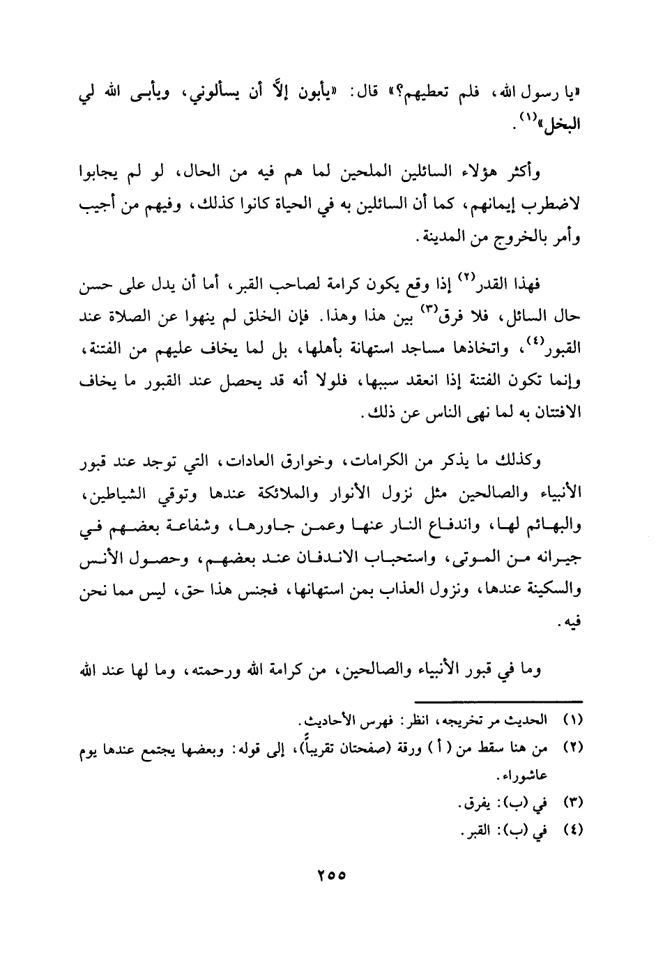 وكذلك ما يذكر من الكرامات، وخوارق العادات، التي توجد عند قبور الأنبياء والصالحين مثل نزول الأنوار والملائكة عندها وتوقي الشياطين والبهائم لها، واندفاع النار عنها وعمن جاورها، وشفاعة بعضهم في جيرانه من الموتى، واستحباب الاندفان عند بعضهم، وحصول الأنس والسكينة عندها، ونزول العذاب بمن استهانها - فجنس هذا حق، ليس مما نحن فيه.