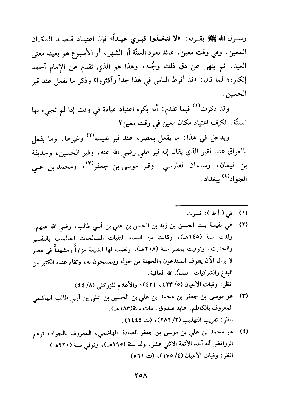 ويدخل في هذا: ما يفعل بمصر، عند قبر نفيسة (¬2) وغيرها. وما يفعل بالعراق عند القبر الذي يقال إنه قبر علي رضي الله عنه، وقبر الحسين، وحذيفة بن اليمان، وسلمان الفارسي. وقبر موسى بن جعفر (¬3) ومحمد بن علي الجواد (¬4) ببغداد.