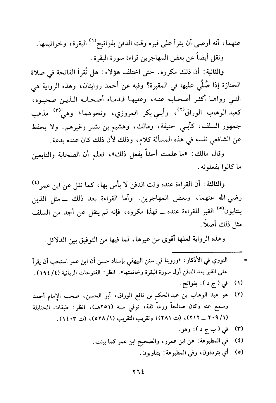 والثانية: أن ذلك مكروه. حتى اختلف هؤلاء: هل تقرأ الفاتحة في صلاة الجنازة إذا صُلِّيَ عليها في المقبرة؟ وفيه عن أحمد روايتان، وهذه الرواية هي التي رواها أكثر أصحابه عنه، وعليها قدماء أصحابه الذين صحبوه، كعبد الوهاب الوراق (¬2) وأبي بكر المروزي، ونحوهما، وهي (¬3) مذهب جمهور السلف، كأبي حنيفة ومالك وهشيم بن بشير وغيرهم، ولا يحفظ عن الشافعي نفسه في هذه المسألة كلام، وذلك لأن ذلك كان عنده بدعة.