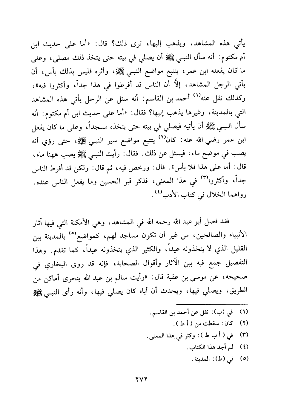 فقد فصل أبو عبد الله رحمه الله في المشاهد، وهي الأمكنة التي فيها آثار الأنبياء والصالحين، من غير أن تكون مساجد لهم، كمواضع بالمدينة (¬5) بين القليل الذي لا يتخذونه عيدا، والكثير الذي يتخذونه عيدا، كما تقدم. وهذا التفصيل جمع فيه بين الآثار وأقوال الصحابة، فإنه قد روى البخاري في صحيحه، عن موسى بن عقبة قال: " رأيت سالم بن عبد الله يتحرى أماكن من الطريق، ويصلي فيها، ويحدث أن أباه كان يصلي فيها، وأنه رأى النبي صلى الله عليه وسلم