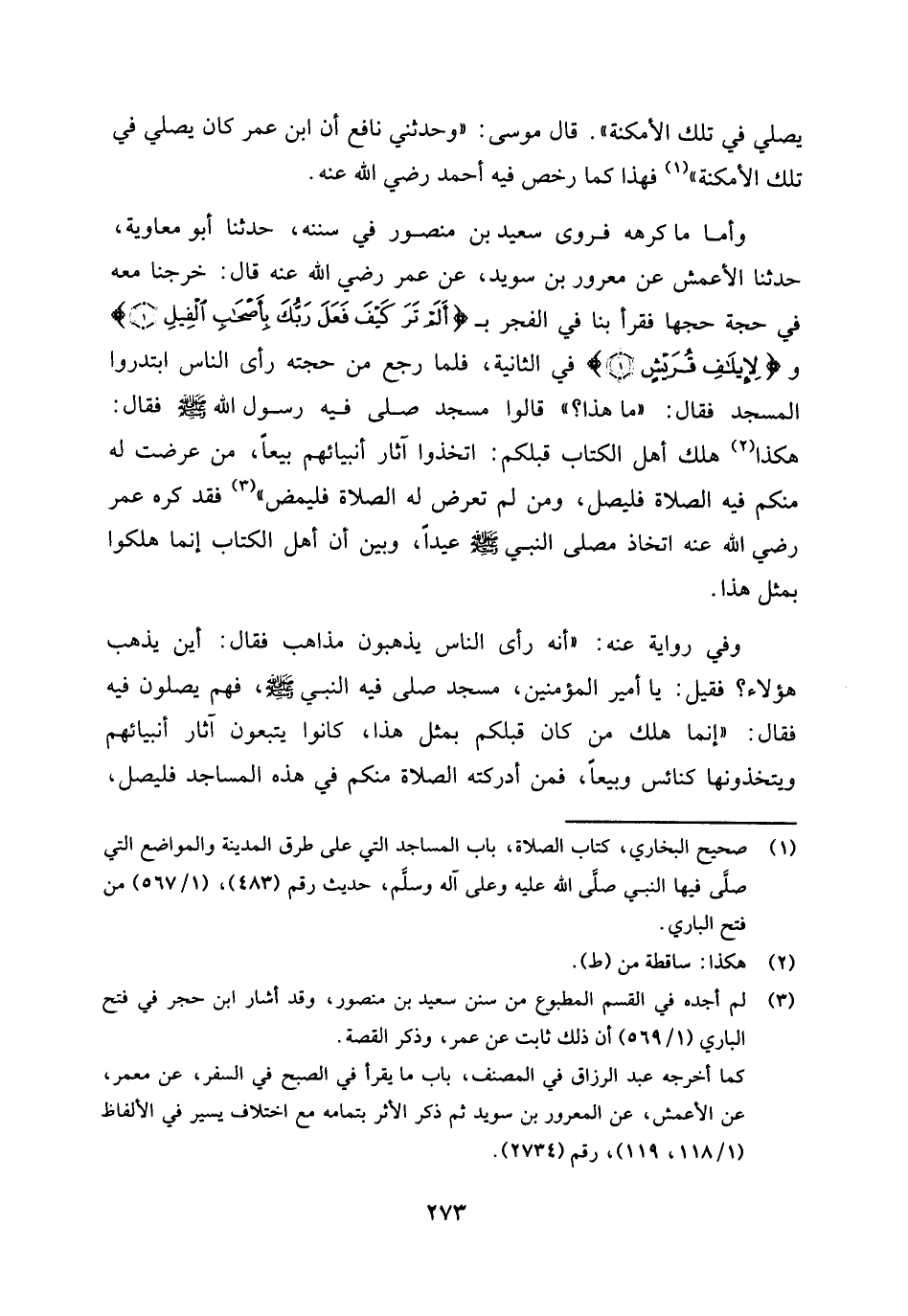 وأما ما كرهه: فروى سعيد بن منصور في سننه، حدثنا أبو معاوية، حدثنا الأعمش عن معرور بن سويد، " عن عمر رضي الله عنه قال: خرجنا معه في حجة حجها فقرأ بنا في الفجر بـ {أَلَمْ تَرَ كَيْفَ فَعَلَ رَبُّكَ بِأَصْحَابِ الْفِيلِ} [الفيل: 1] و {لِإِيلَافِ قُرَيْشٍ} [قريش: 1] في الثانية، فلما رجع من حجته رأى الناس ابتدروا المسجد فقال: ما هذا؟ قالوا: مسجد صلى فيه رسول الله صلى الله عليه وسلم فقال: هكذا (¬2) هلك أهل الكتاب قبلكم: اتخذوا آثار أنبيائهم بيعا، من عرضت له منكم فيه الصلاة فليصل، ومن لم تعرض له الصلاة فليمض " (¬3) فقد كره عمر رضي الله عنه اتخاذ مصلى النبي صلى الله عليه وسلم عيدا، وبين أن أهل الكتاب إنما هلكوا بمثل هذا.