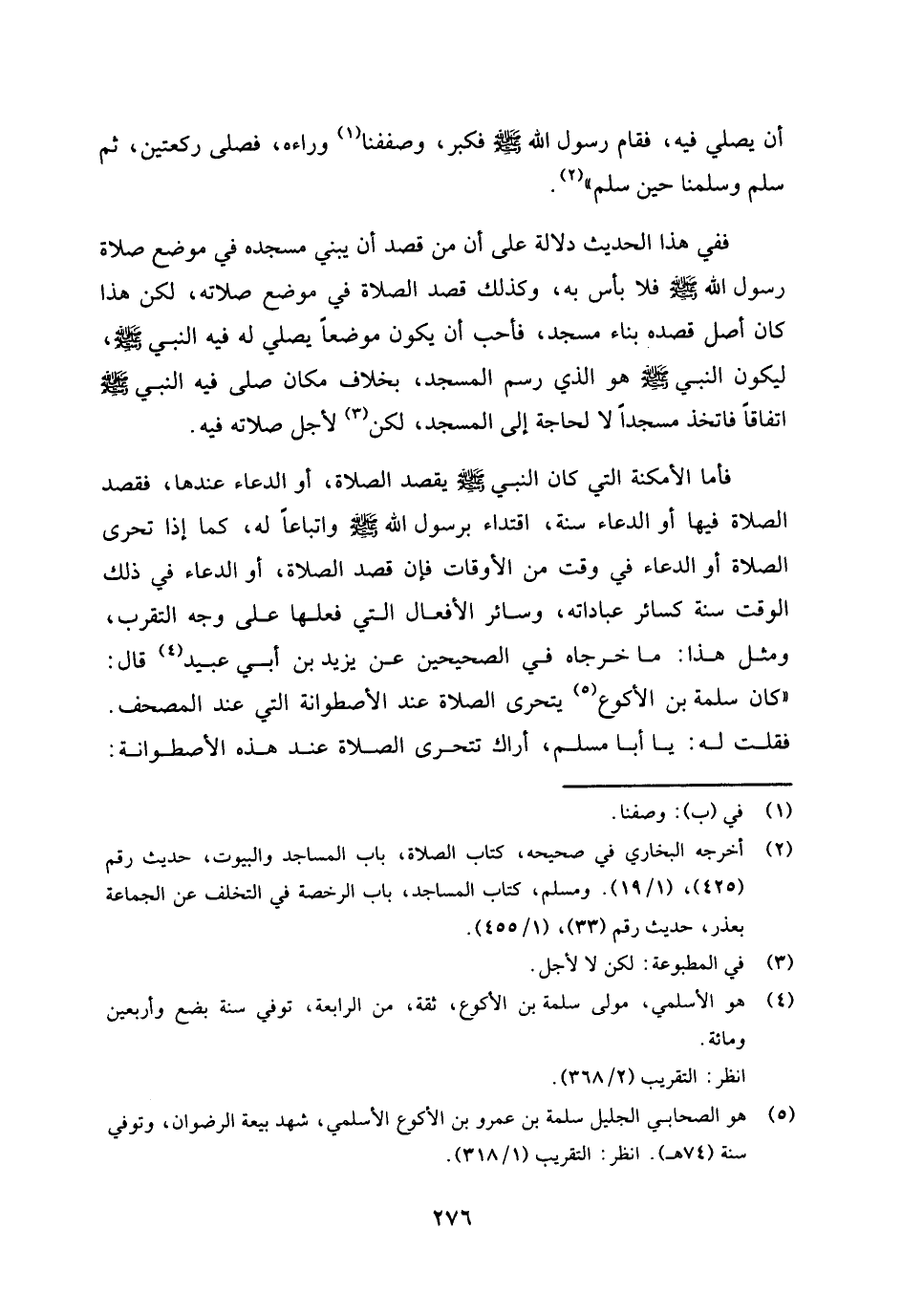 فأما الأمكنة التي كان النبي صلى الله عليه وسلم يقصد الصلاة أو الدعاء عندها، فقصد الصلاة فيها أو الدعاء سنة، اقتداء برسول الله صلى الله عليه وسلم واتباعا له، كما إذا تحرى الصلاة أو الدعاء في وقت من الأوقات فإن قصد الصلاة أو الدعاء في ذلك الوقت سنة كسائر عباداته، وسائر الأفعال التي فعلها على وجه التقرب ومثل هذا: ما خرجاه في الصحيحين عن يزيد بن أبي عبيد (¬4) قال: " كان سلمة بن الأكوع (¬5) يتحرى الصلاة عند الأصطوانة التي عند المصحف. فقلت له: يا أبا مسلم، أراك تتحرى الصلاة عند هذه الأصطوانة،