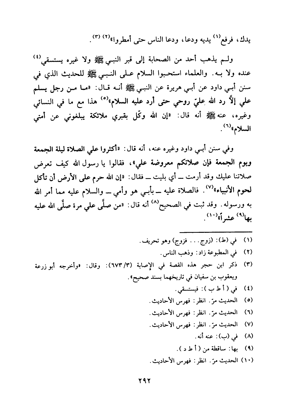 وفي سنن أبي داود وغيره عنه، أنه قال «أكثروا من الصلاة علي ليلة الجمعة ويوم الجمعة فإن صلاتكم معروضة علي "، فقالوا يا رسول الله، كيف تعرض صلاتنا عليك وقد أرمت؟ -أي بليت -فقال: " إن الله حرم على الأرض أن تأكل لحوم الأنبياء» (¬6) . فالصلاة عليه -بأبي هو وأمي- والسلام عليه مما أمر الله به ورسوله، وقد ثبت في الصحيح (¬7) أنه قال «من صلى علي مرة صلى الله عليه بها (¬8) عشرا» (¬9) .