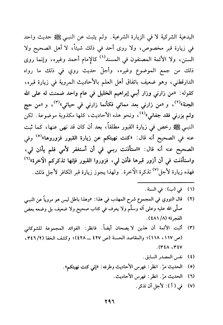 البدعية الشركية لا في الزيارة الشرعية، ولم يثبت عن النبي صلى الله عليه وسلم حديث واحد في زيارة قبر مخصوص، ولا روى أحد في ذلك شيئًا، لا أهل الصحيح ولا السنن، ولا الأئمة المصنفون في المسند (¬1) كالإمام أحمد وغيره.