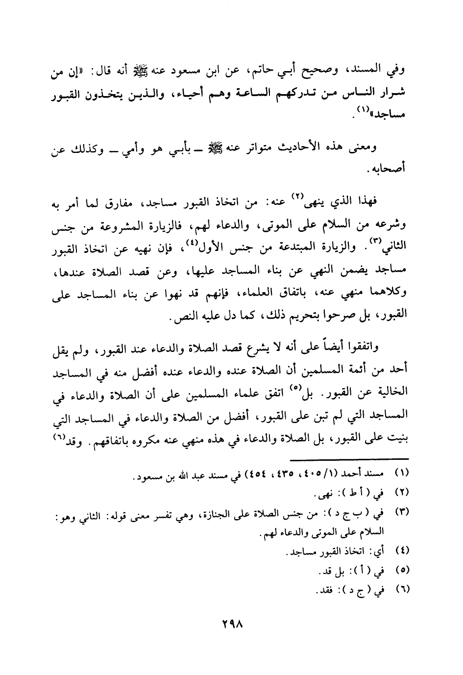 وفي المسند، وصحيح أبي حاتم، عن ابن مسعود عنه صلى الله عليه وسلم أنه قال: «إن من شرار الناس من تدركهم الساعة وهم أحياء، والذين يتخذون القبور مساجد» (¬1) .