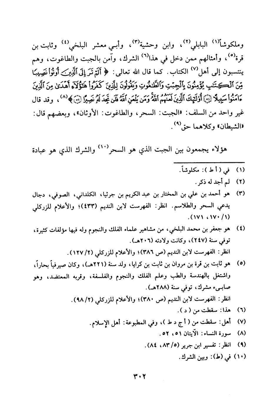 الهندي، وملكوشا (¬1) البابلي (¬2) وابن وحشية (¬3) وأبي معشر البلخي (¬4) وثابت بن قرة (¬5) وأمثالهم ممن دخل في هذا (¬6) الشرك، وآمن بالجبت والطاغوت، وهم ينتسبون إلى أهل (¬7) الكتاب. كما قال تعالى {أَلَمْ تَرَ إِلَى الَّذِينَ أُوتُوا نَصِيبًا مِنَ الْكِتَابِ يُؤْمِنُونَ بِالْجِبْتِ وَالطَّاغُوتِ وَيَقُولُونَ لِلَّذِينَ كَفَرُوا هَؤُلَاءِ أَهْدَى مِنَ الَّذِينَ آمَنُوا سَبِيلًا - أُولَئِكَ الَّذِينَ لَعَنَهُمُ اللَّهُ وَمَنْ يَلْعَنِ اللَّهُ فَلَنْ تَجِدَ لَهُ نَصِيرًا} [النساء: 51 - 52] (¬8) وقد قال غير واحد من السلف: " الجبت: السحر، والطاغوت: الأوثان "، وبعضهم قال: "الشيطان" وكلاهما حق (¬9) .
