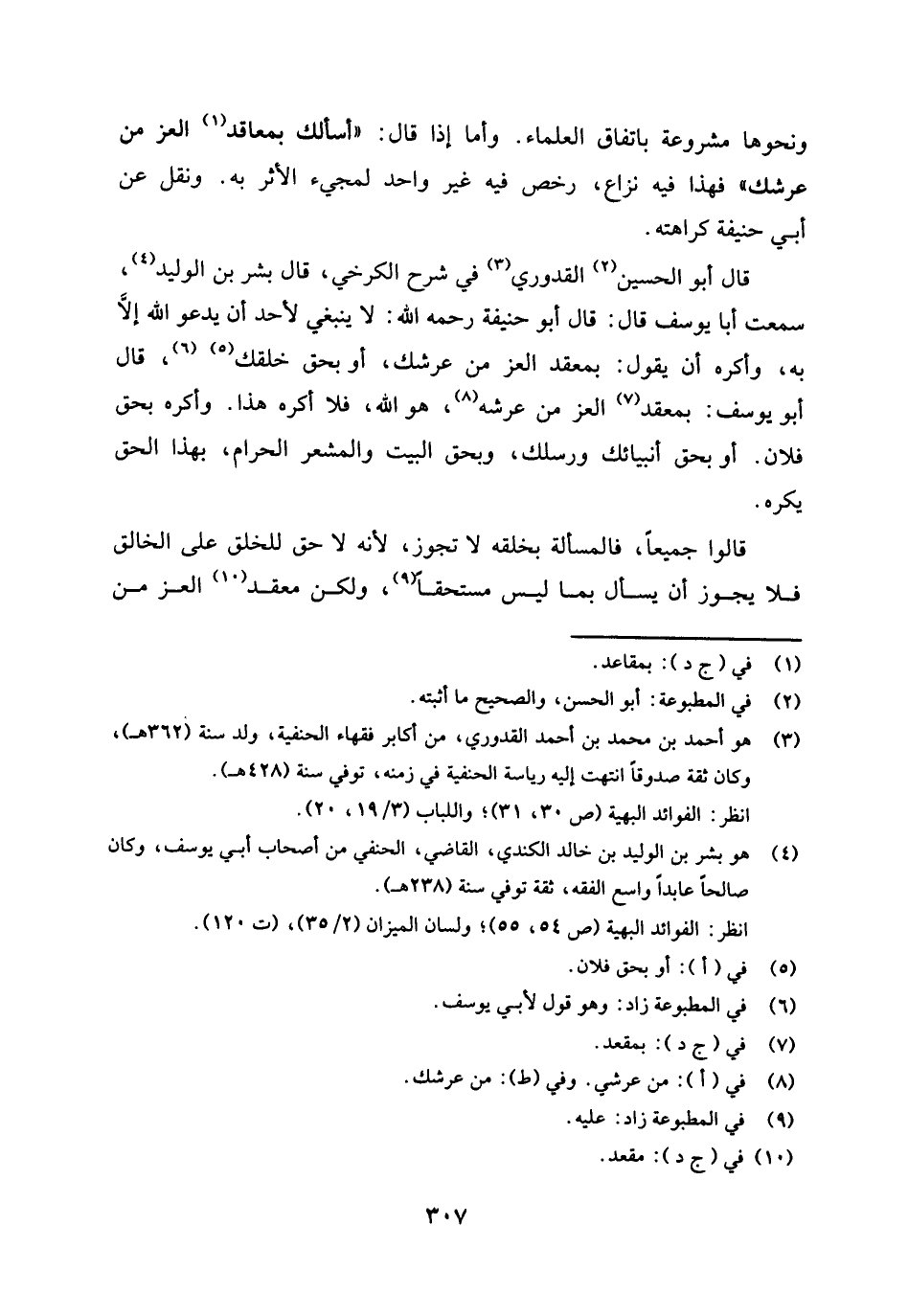 قال أبو الحسين (¬2) القدوري (¬3) في (شرح الكرخي) : قال بشر بن الوليد (¬4) سمعت أبا يوسف قال: قال أبو حنيفة رحمه الله: لا ينبغي لأحد أن يدعو الله إلا به، وأكره أن يقول: بمعقد العز من عرشك، أو بحق خلقك (¬5) . قال أبو يوسف: بمعقد (¬6) العز من عرشه (¬7) هو الله، فلا أكره هذا، وأكره: بحق فلان، أو بحق أنبيائك ورسلك، وبحق البيت والمشعر الحرام، بهذا الحق يكره.