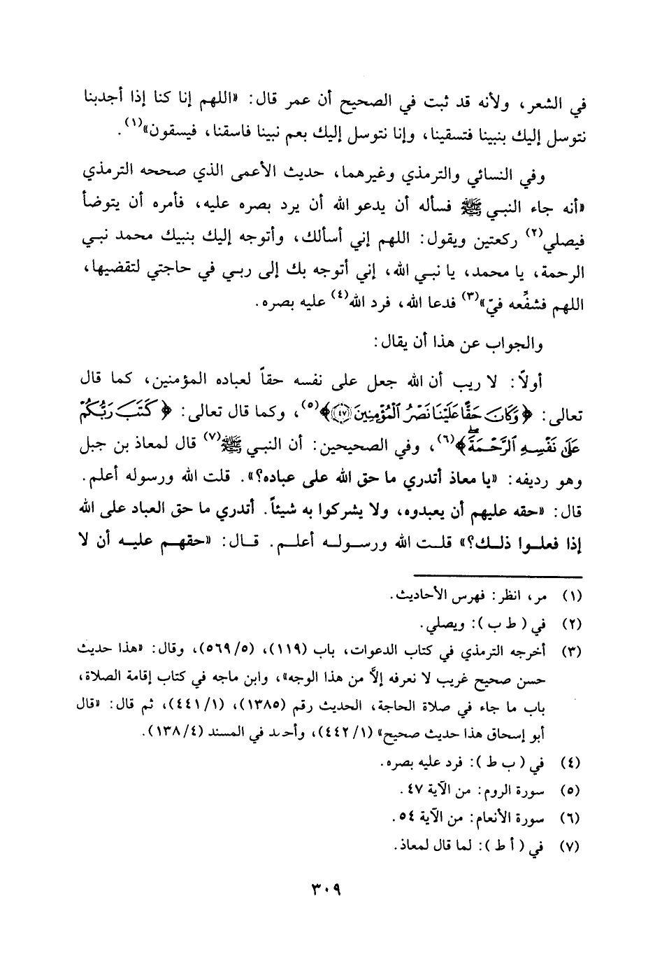 وفي النسائي والترمذي وغيرهما: حديث الأعمى الذي صححه الترمذي وغيرهما: " أنه جاء النبي صلى الله عليه وسلم فسأله أن يدعو الله أن يرد بصره فأمره أن يتوضأ فيصلي (¬2) ركعتين ويقول: «اللهم إني أسألك، وأتوجه إليك بنبيك محمد نبي الرحمة، يا محمد، يا نبي الله إني أتوجه بك إلى ربي في حاجتي لتقضيها (¬3) اللهم فشفعه في» (¬4) فدعا الله، فرد الله (¬5) عليه بصره.