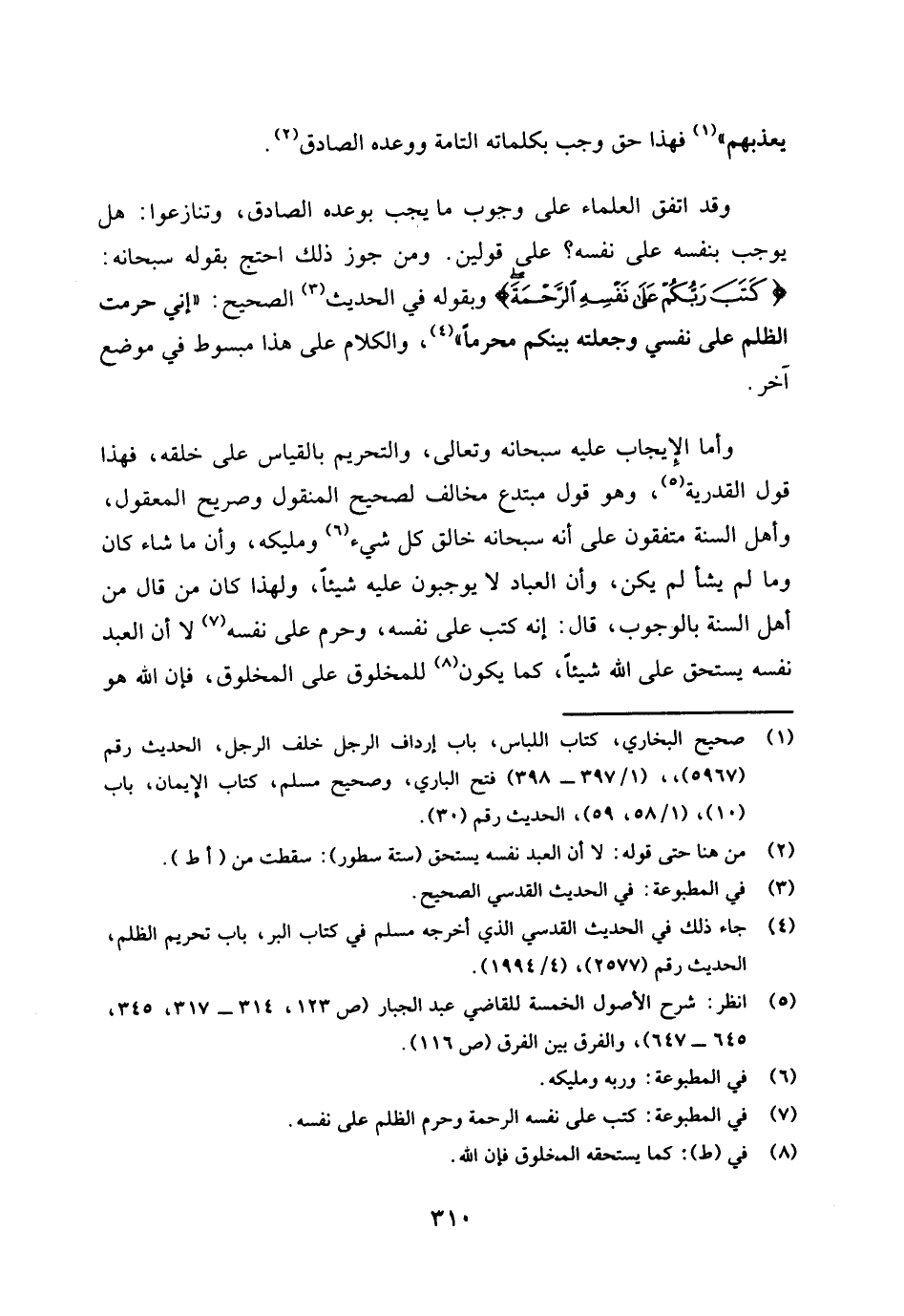 وقد اتفق العلماء على وجوب ما يجب بوعده الصادق، وتنازعوا: هل يوجب بنفسه على نفسه؟ على قولين. ومن جوز ذلك احتج بقوله سبحانه: {كَتَبَ رَبُّكُمْ عَلَى نَفْسِهِ الرَّحْمَةَ} [الأنعام: 54] وبقوله في الحديث (¬3) الصحيح: «إني حرمت الظلم على نفسي وجعلته بينكم محرما» (¬4) والكلام على هذا مبسوط في موضع آخر.