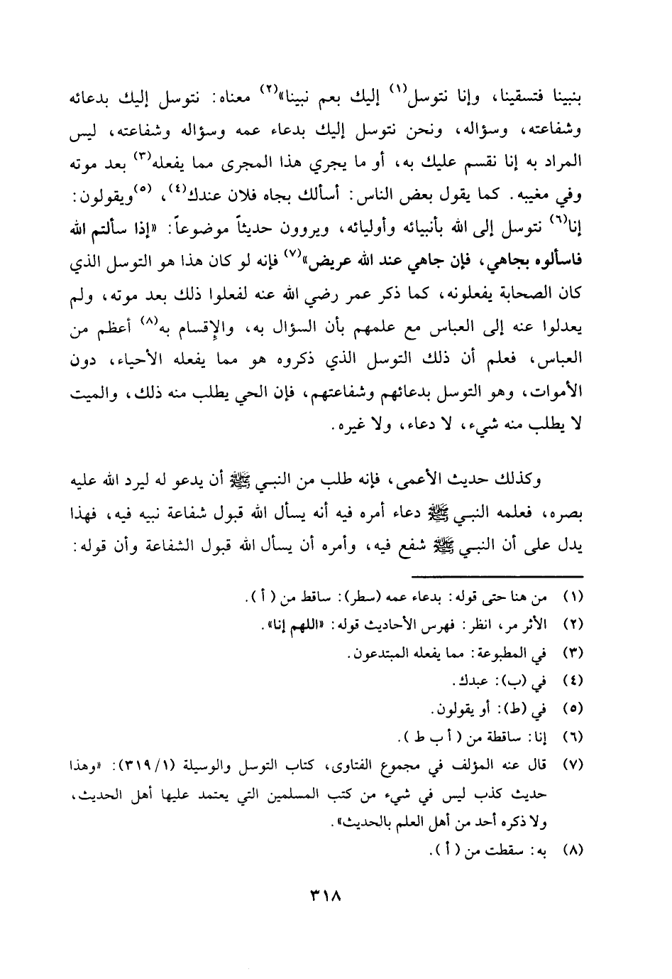 بنبينا فتسقينا، وإنا نتوسل (¬1) إليك بعم نبينا " (¬2) معناه: نتوسل إليك بدعائه وشفاعته، وسؤاله ونحن نتوسل إليك بدعاء عمه وسؤاله وشفاعته، ليس المراد به أنا نقسم عليك به أو ما يجري هذا المجرى مما يفعله (¬3) بعد موته وفي مغيبه، كما يقول بعض الناس: أسألك بجاه فلان عندك (¬4) (¬5) ويقولون: إنا (¬6) نتوسل إلى الله بأنبيائه وأوليائه، ويروون حديثا موضوعا: «إذا سألتم الله فاسألوه بجاهي، فإن جاهي عند الله عريض» (¬7) .